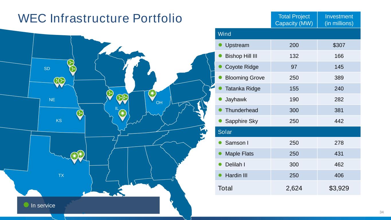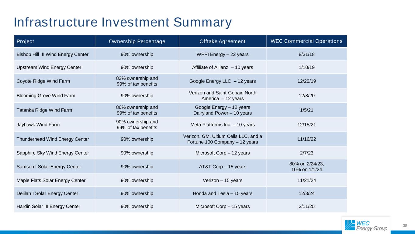 34 In service Total Project Capacity (MW) Investment (in millions) Wind ● Upstream 200 $307 ● Bishop Hill III 132 166 ● Coyote Ridge 97 145 ● Blooming Grove 250 389 ● Tatanka Ridge 155 240 ● Jayhawk 190 282 ● Thunderhead 300 381 ● Sapphire Sky 250 442 Solar ● Samson I 250 278 ● Maple Flats 250 431 ● Delilah I 300 462 ● Hardin III 250 406 Total 2,624 $3,929 SD IL NE KS TX OH WEC Infrastructure Portfolio