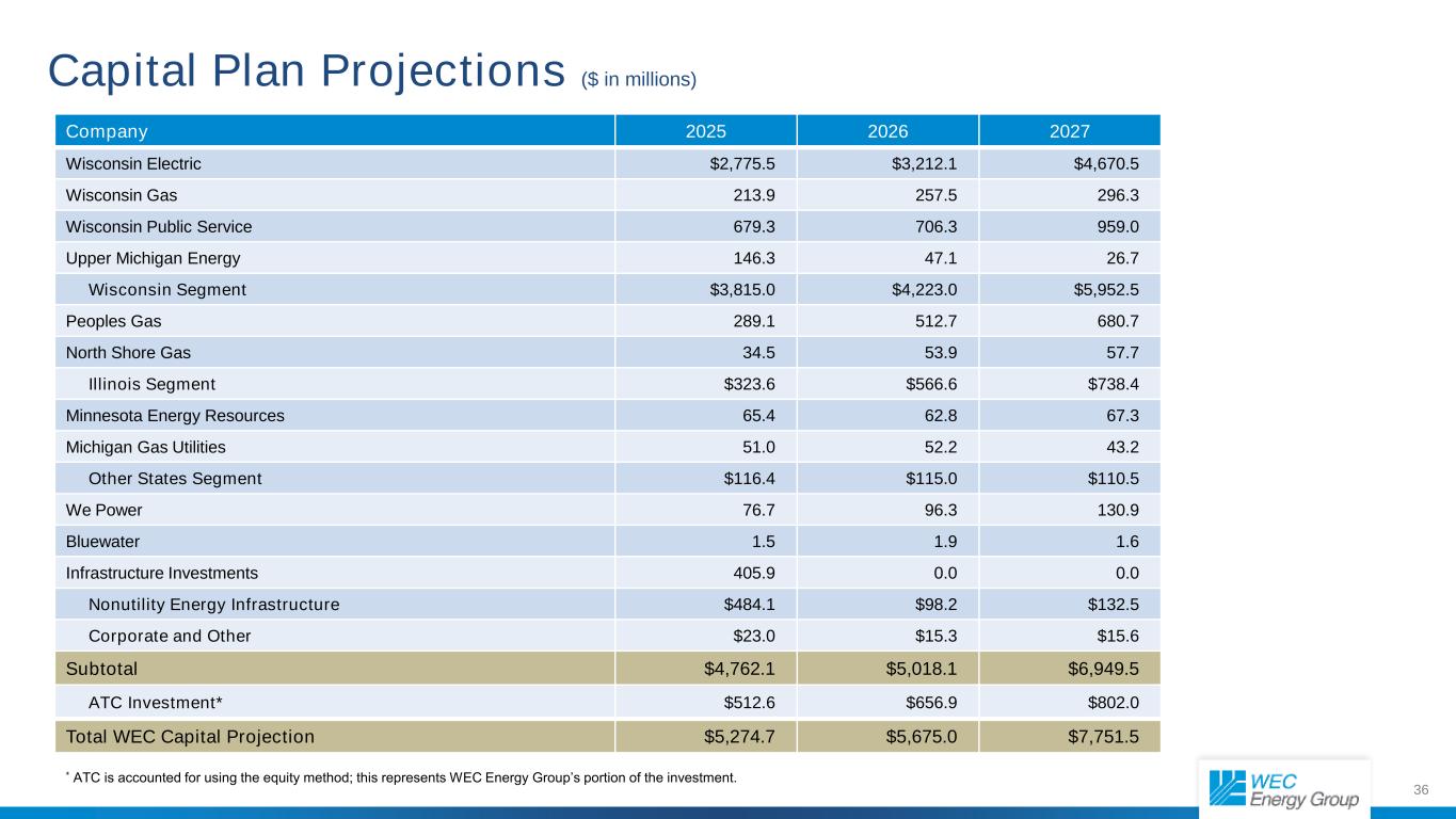 36 Company 2025 2026 2027 Wisconsin Electric $2,775.5 $3,212.1 $4,670.5 Wisconsin Gas 213.9 257.5 296.3 Wisconsin Public Service 679.3 706.3 959.0 Upper Michigan Energy 146.3 47.1 26.7 Wisconsin Segment $3,815.0 $4,223.0 $5,952.5 Peoples Gas 289.1 512.7 680.7 North Shore Gas 34.5 53.9 57.7 Illinois Segment $323.6 $566.6 $738.4 Minnesota Energy Resources 65.4 62.8 67.3 Michigan Gas Utilities 51.0 52.2 43.2 Other States Segment $116.4 $115.0 $110.5 We Power 76.7 96.3 130.9 Bluewater 1.5 1.9 1.6 Infrastructure Investments 405.9 0.0 0.0 Nonutility Energy Infrastructure $484.1 $98.2 $132.5 Corporate and Other $23.0 $15.3 $15.6 Subtotal $4,762.1 $5,018.1 $6,949.5 ATC Investment* $512.6 $656.9 $802.0 Total WEC Capital Projection $5,274.7 $5,675.0 $7,751.5 Capital Plan Projections ($ in millions) * ATC is accounted for using the equity method; this represents WEC Energy Group’s portion of the investment.