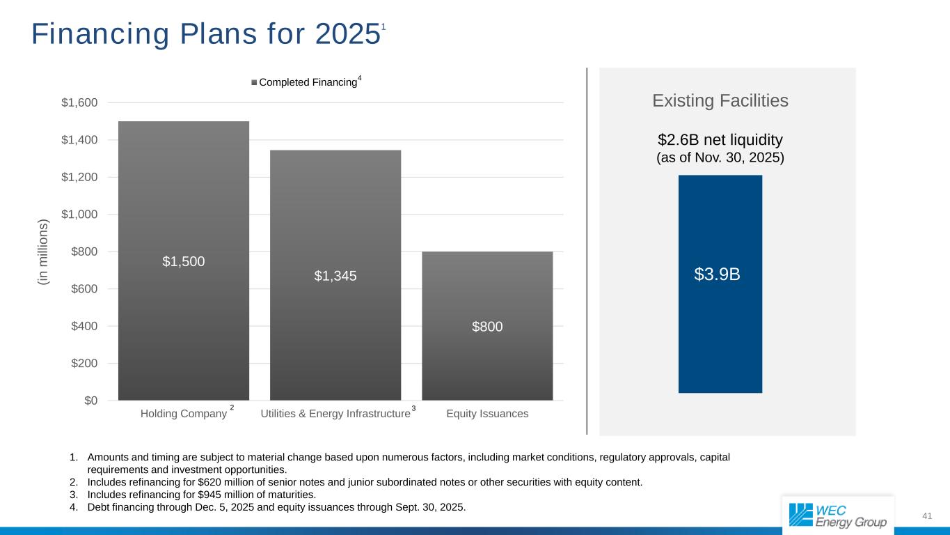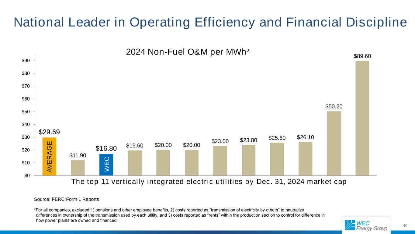 40 National Leader in Operating Efficiency and Financial Discipline $29.69 $11.90 $16.80 $19.60 $20.00 $20.00 $23.00 $23.80 $25.60 $26.10 $50.20 $89.60 $0 $10 $20 $30 $40 $50 $60 $70 $80 $90 2024 Non-Fuel O&M per MWh* Source: FERC Form 1 Reports *For all companies, excluded 1) pensions and other employee benefits, 2) costs reported as “transmission of electricity by others” to neutralize differences in ownership of the transmission used by each utility, and 3) costs reported as “rents” within the production section to control for difference in how power plants are owned and financed. The top 11 vertically integrated electric utilities by Dec. 31, 2024 market cap W E C A V E R A G E
