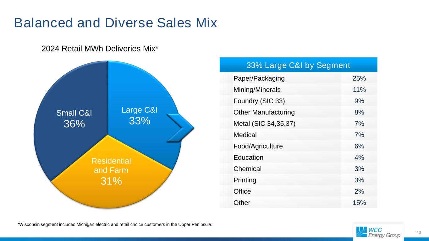 43 33% Large C&I by Segment Paper/Packaging 25% Mining/Minerals 11% Foundry (SIC 33) 9% Other Manufacturing 8% Metal (SIC 34,35,37) 7% Medical 7% Food/Agriculture 6% Education 4% Chemical 3% Printing 3% Office 2% Other 15% Balanced and Diverse Sales Mix Large C&I 33% Residential and Farm 31% Small C&I 36% 2024 Retail MWh Deliveries Mix* *Wisconsin segment includes Michigan electric and retail choice customers in the Upper Peninsula.