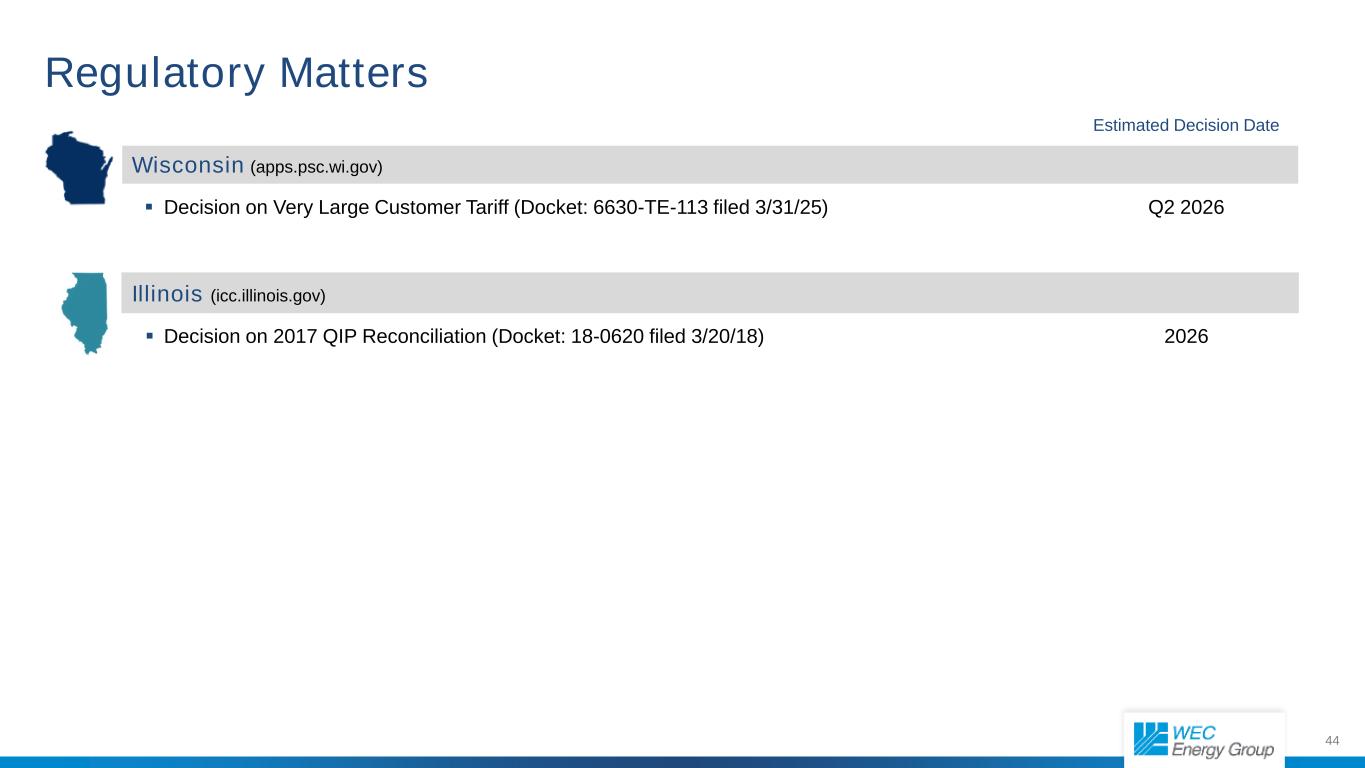 44 Estimated Decision Date Wisconsin (apps.psc.wi.gov) Decision on Very Large Customer Tariff (Docket: 6630-TE-113 filed 3/31/25) Q2 2026 Illinois (icc.illinois.gov) Decision on 2017 QIP Reconciliation (Docket: 18-0620 filed 3/20/18) 2026 Regulatory Matters