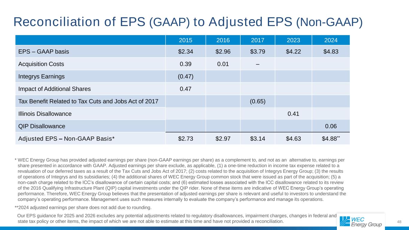 48 Reconciliation of EPS (GAAP) to Adjusted EPS (Non-GAAP) 2015 2016 2017 2023 2024 EPS – GAAP basis $2.34 $2.96 $3.79 $4.22 $4.83 Acquisition Costs 0.39 0.01 – Integrys Earnings (0.47) Impact of Additional Shares 0.47 Tax Benefit Related to Tax Cuts and Jobs Act of 2017 (0.65) Illinois Disallowance 0.41 QIP Disallowance 0.06 Adjusted EPS – Non-GAAP Basis* $2.73 $2.97 $3.14 $4.63 $4.88** * WEC Energy Group has provided adjusted earnings per share (non-GAAP earnings per share) as a complement to, and not as an alternative to, earnings per share presented in accordance with GAAP. Adjusted earnings per share exclude, as applicable, (1) a one-time reduction in income tax expense related to a revaluation of our deferred taxes as a result of the Tax Cuts and Jobs Act of 2017; (2) costs related to the acquisition of Integrys Energy Group; (3) the results of operations of Integrys and its subsidiaries; (4) the additional shares of WEC Energy Group common stock that were issued as part of the acquisition; (5) a non-cash charge related to the ICC’s disallowance of certain capital costs; and (6) estimated losses associated with the ICC disallowance related to its review of the 2016 Qualifying Infrastructure Plant (QIP) capital investments under the QIP rider. None of these items are indicative of WEC Energy Group’s operating performance. Therefore, WEC Energy Group believes that the presentation of adjusted earnings per share is relevant and useful to investors to understand the company’s operating performance. Management uses such measures internally to evaluate the company’s performance and manage its operations. **2024 adjusted earnings per share does not add due to rounding. Our EPS guidance for 2025 and 2026 excludes any potential adjustments related to regulatory disallowances, impairment charges, changes in federal and state tax policy or other items, the impact of which we are not able to estimate at this time and have not provided a reconciliation.
