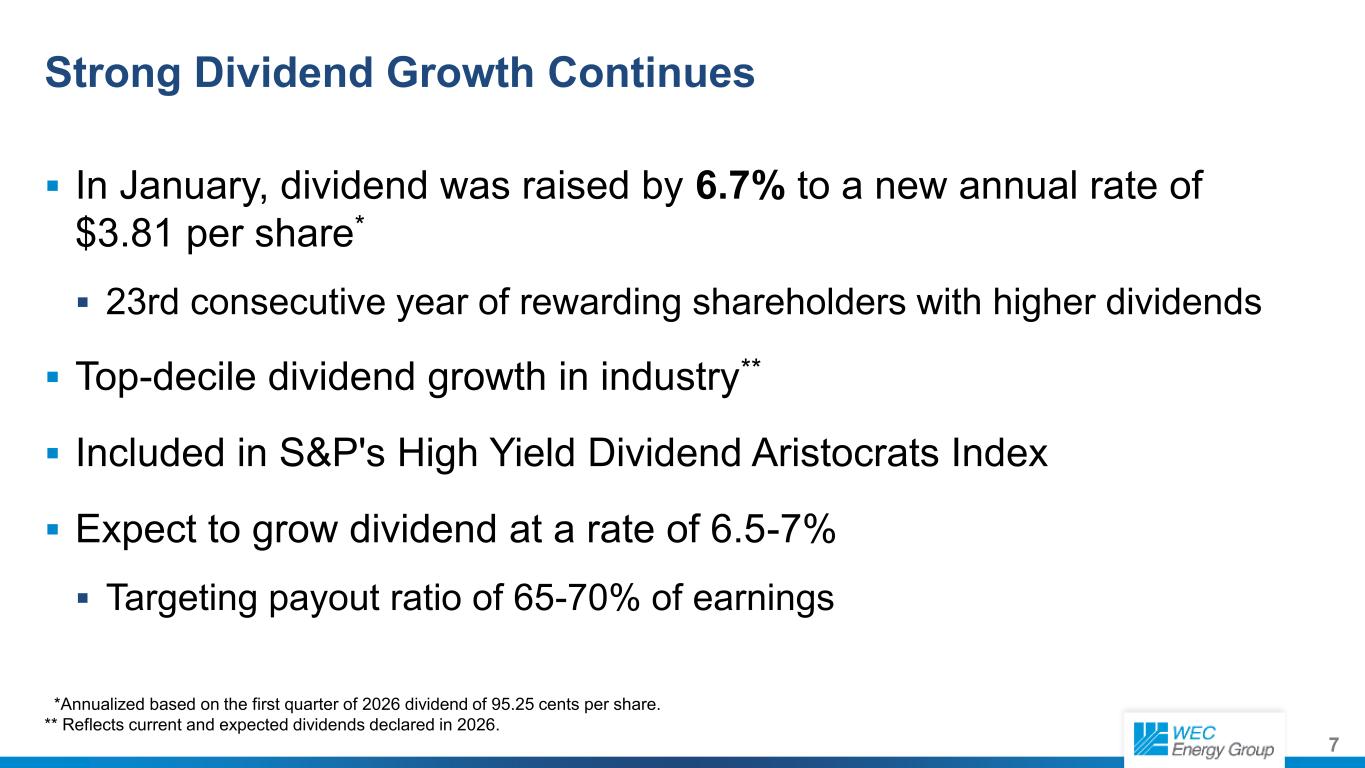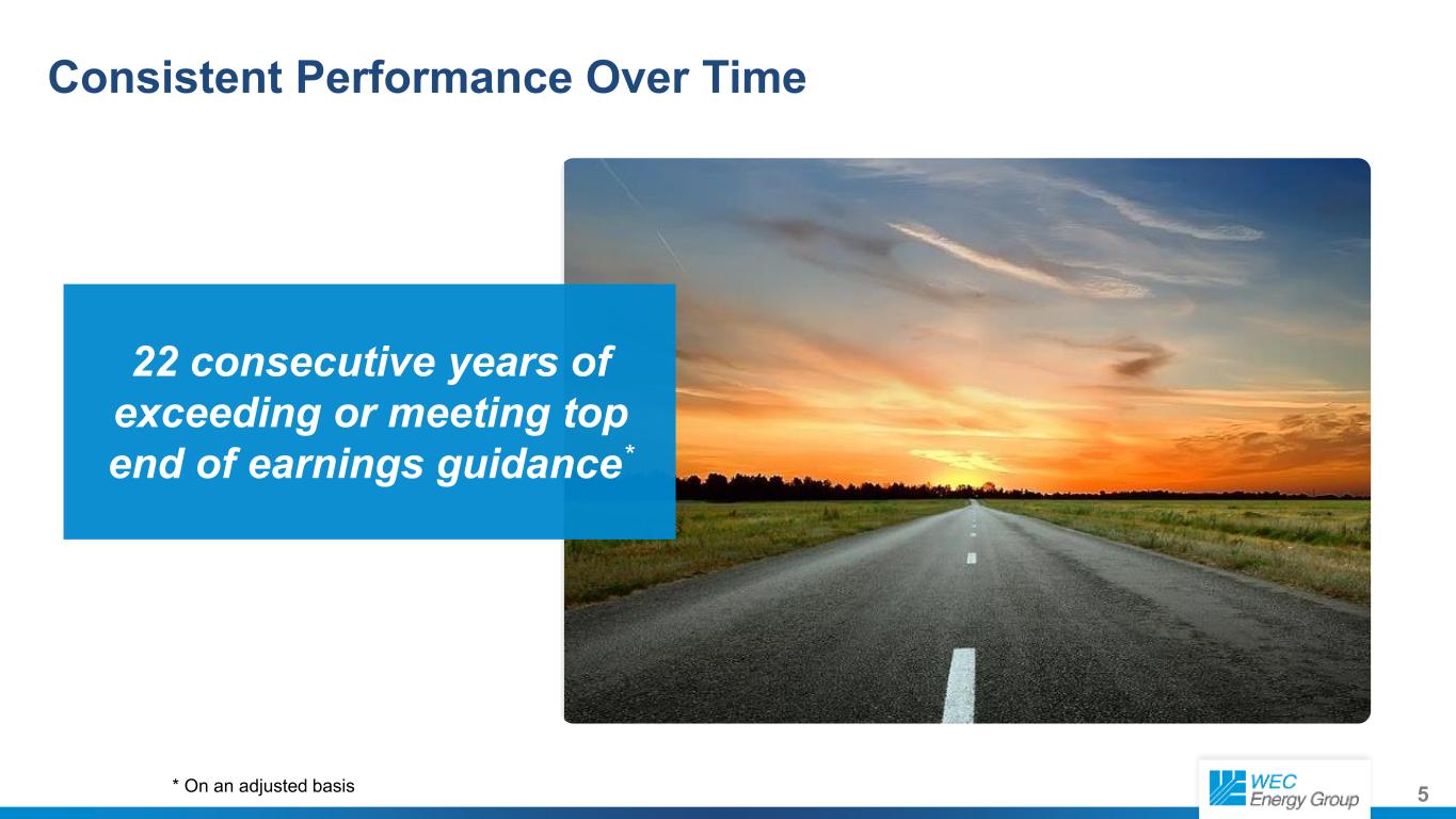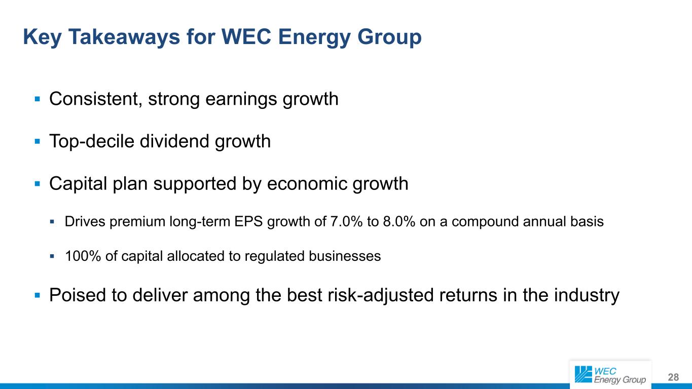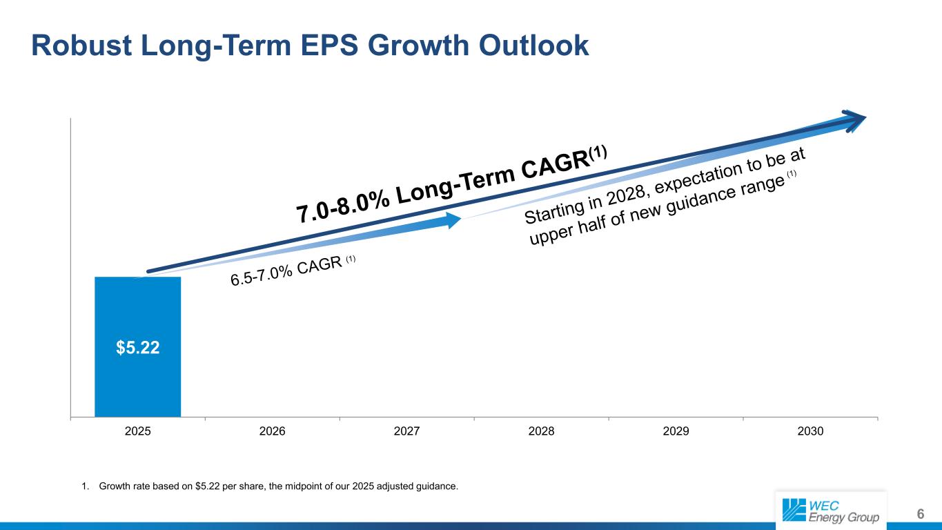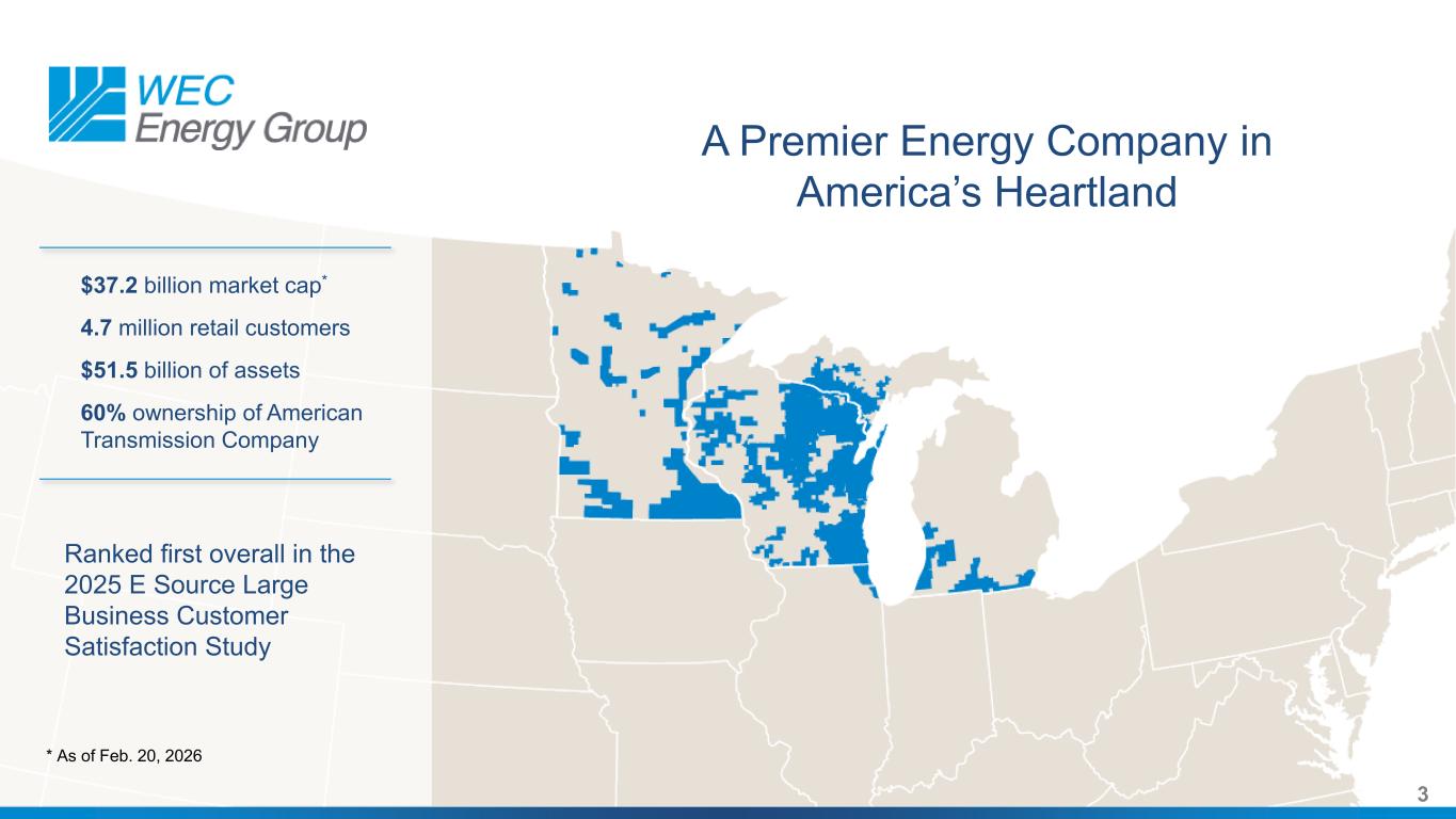 2 Cautionary Statement Regarding Forward-Looking Information Much of the information contained in this presentation is forward-looking information based upon management’s current expectations and projections that involve risks and uncertainties. Forward-looking information includes, among other things, information concerning earnings per share, rate case activity, earnings per share growth, cash flow, sources of revenue, dividend growth and dividend payout ratios, sales volumes, capital plans, credit ratings, credit metrics, debt-financings, construction costs, investment opportunities, corporate initiatives, rate base, and environmental matters (including emission reductions). Readers are cautioned not to place undue reliance on this forward-looking information. Forward-looking information is not a guarantee of future performance and actual results may differ materially from those set forth in the forward-looking information. Factors that could cause actual results to differ materially from those contemplated in any forward-looking statements include, but are not limited to: general economic conditions, including business and competitive conditions in the company’s service territories; timing, resolution and impact of rate cases and other regulatory decisions, including rider reconciliations; the company’s ability to continue to successfully integrate the operations of its subsidiaries; availability of the company’s generating facilities and/or distribution systems; unanticipated changes in fuel and purchased power costs; key personnel changes; unusual, varying or severe weather conditions; continued industry restructuring and consolidation; continued advances in, and adoption of, new technologies that produce power or reduce power consumption; energy and environmental conservation efforts; electrification initiatives, mandates and other efforts to reduce the use of natural gas; the company’s ability to successfully acquire and/or dispose of assets and projects and to execute on its capital plan, including projects related to providing services to data centers and other large-scale customers; terrorist, physical or cyber-security threats or attacks and data security breaches; construction risks; labor disruptions; equity and bond market fluctuations; changes in the company’s and its subsidiaries’ ability to access the capital markets; changes in tax legislation or our ability to use certain tax benefits and carryforwards; changes in and uncertainty around federal, state, and local legislation and regulation, including changes in rate-setting policies or procedures and environmental standards, in the enforcement of these laws and regulations and in the interpretation of regulations or permit conditions by regulatory agencies; supply chain disruptions; inflation; political or geopolitical developments, including impacts on the global economy, supply chain and fuel prices, generally, including as a result of changes to government trade policies, geopolitical tensions between the U.S. and other countries, or other new, protracted or escalating regional or international conflicts; the impact from any health crises, including epidemics and pandemics; current and future litigation and regulatory investigations, proceedings or inquiries; the ability of the Company to successfully and/or timely adopt new technologies, including artificial intelligence; changes in accounting standards; the financial performance of the American Transmission Company as well as projects in which the company’s energy infrastructure business invests; the ability of the company to obtain additional generating capacity at competitive prices; goodwill and its possible impairment; and other factors described under the heading “Factors Affecting Results, Liquidity and Capital Resources” in Management’s Discussion and Analysis of Financial Condition and Results of Operations and under the headings “Cautionary Statement Regarding Forward-Looking Information” and “Risk Factors” contained in WEC Energy Group’s Form 10-K for the year ended December 31, 2024, and in subsequent reports filed with the Securities and Exchange Commission. Except as may be required by law, WEC Energy Group expressly disclaims any obligation to publicly update or revise any forward-looking information.