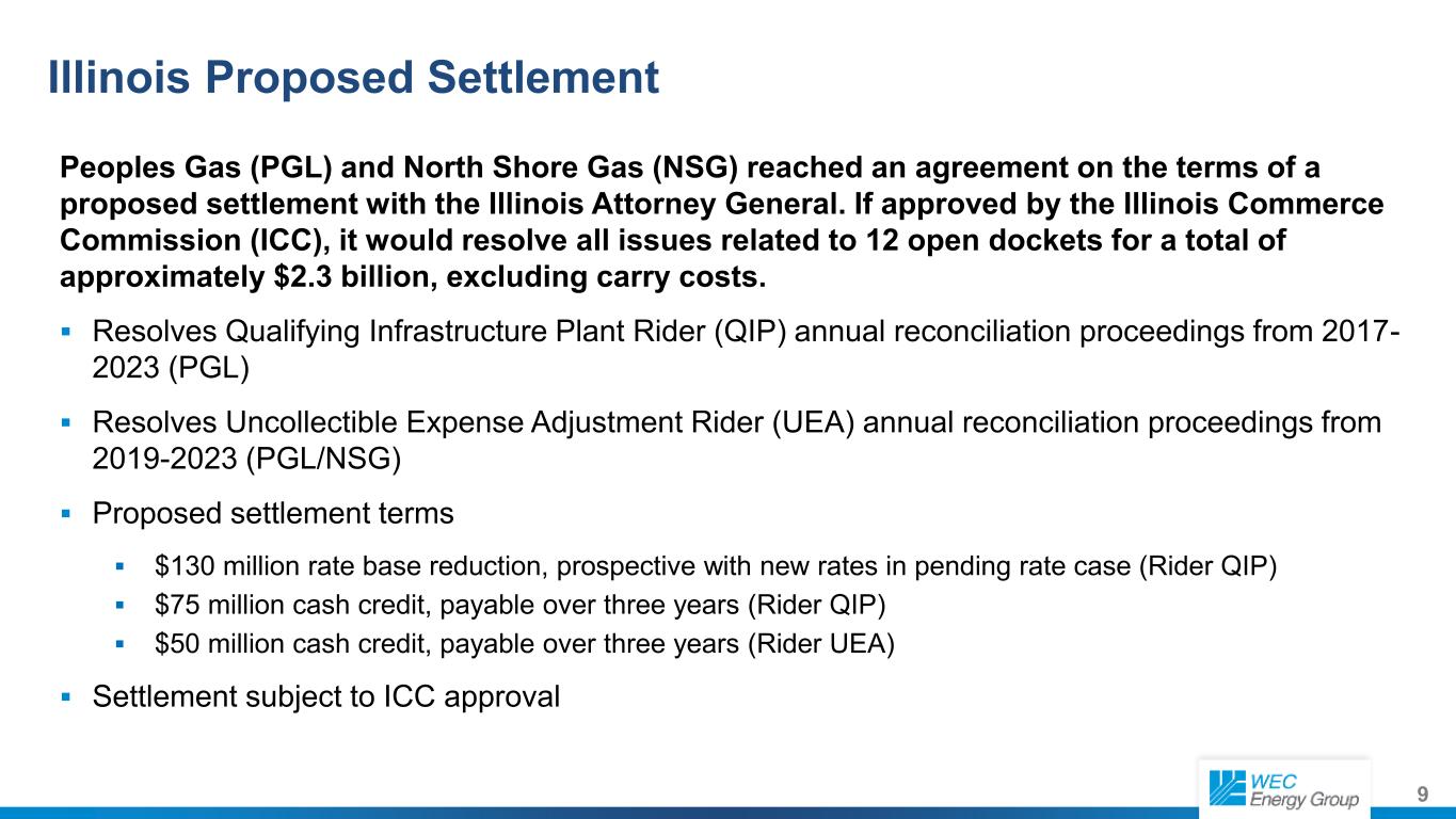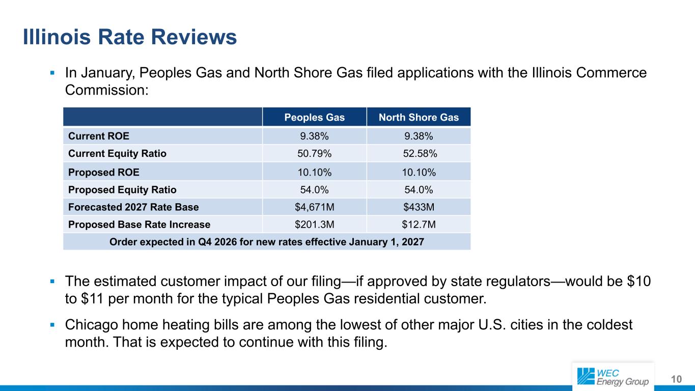 9 Illinois Proposed Settlement Peoples Gas (PGL) and North Shore Gas (NSG) reached an agreement on the terms of a proposed settlement with the Illinois Attorney General. If approved by the Illinois Commerce Commission (ICC), it would resolve all issues related to 12 open dockets for a total of approximately $2.3 billion, excluding carry costs. ▪ Resolves Qualifying Infrastructure Plant Rider (QIP) annual reconciliation proceedings from 2017- 2023 (PGL) ▪ Resolves Uncollectible Expense Adjustment Rider (UEA) annual reconciliation proceedings from 2019-2023 (PGL/NSG) ▪ Proposed settlement terms ▪ $130 million rate base reduction, prospective with new rates in pending rate case (Rider QIP) ▪ $75 million cash credit, payable over three years (Rider QIP) ▪ $50 million cash credit, payable over three years (Rider UEA) ▪ Settlement subject to ICC approval