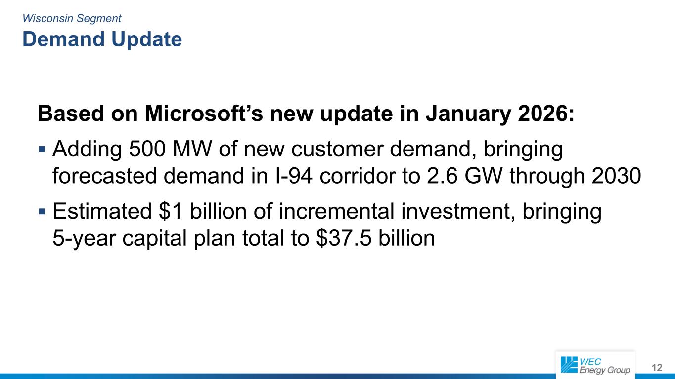 12 Demand Update Based on Microsoft’s new update in January 2026: ▪ Adding 500 MW of new customer demand, bringing forecasted demand in I-94 corridor to 2.6 GW through 2030 ▪ Estimated $1 billion of incremental investment, bringing 5-year capital plan total to $37.5 billion Wisconsin Segment