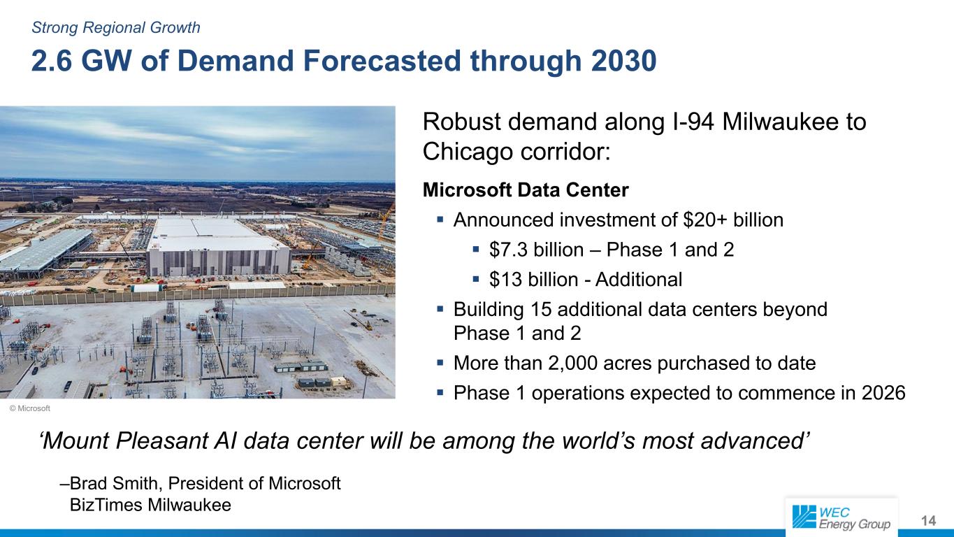 14 2.6 GW of Demand Forecasted through 2030 Robust demand along I-94 Milwaukee to Chicago corridor: Microsoft Data Center ▪ Announced investment of $20+ billion ▪ $7.3 billion – Phase 1 and 2 ▪ $13 billion - Additional ▪ Building 15 additional data centers beyond Phase 1 and 2 ▪ More than 2,000 acres purchased to date ▪ Phase 1 operations expected to commence in 2026 Strong Regional Growth ‘Mount Pleasant AI data center will be among the world’s most advanced’ –Brad Smith, President of Microsoft BizTimes Milwaukee © Microsoft