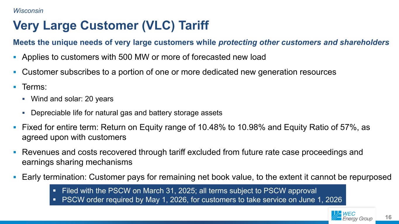 16 Wisconsin Very Large Customer (VLC) Tariff Meets the unique needs of very large customers while protecting other customers and shareholders ▪ Applies to customers with 500 MW or more of forecasted new load ▪ Customer subscribes to a portion of one or more dedicated new generation resources ▪ Terms: ▪ Wind and solar: 20 years ▪ Depreciable life for natural gas and battery storage assets ▪ Fixed for entire term: Return on Equity range of 10.48% to 10.98% and Equity Ratio of 57%, as agreed upon with customers ▪ Revenues and costs recovered through tariff excluded from future rate case proceedings and earnings sharing mechanisms ▪ Early termination: Customer pays for remaining net book value, to the extent it cannot be repurposed ▪ Filed with the PSCW on March 31, 2025; all terms subject to PSCW approval ▪ PSCW order required by May 1, 2026, for customers to take service on June 1, 2026