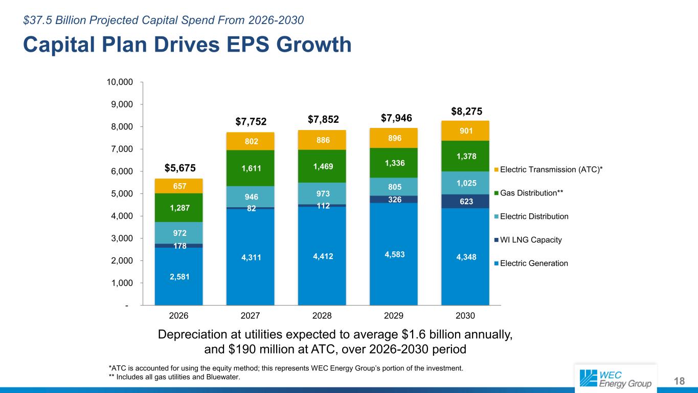 17 $19.3 $20.3 $1.3 $1.3 $4.7 $4.7 $7.1 $7.1 $4.1 $4.1 $36.5 $37.5 2026-2030 2026-2030 Electric Transmission (ATC)* Gas Distribution** Electric Distribution WI LNG Capacity Electric Generation U p d a te d p la n N o v e m b e r 2 0 2 5 p la n *ATC is accounted for using the equity method; this represents WEC Energy Group’s portion of the investment. ** Includes all gas utilities and Bluewater. $ In billions Increasing Five-Year Capital Plan by $1 Billion 2026-2030 Capital Plan Supports 7.0% to 8.0% Long-Term EPS Growth