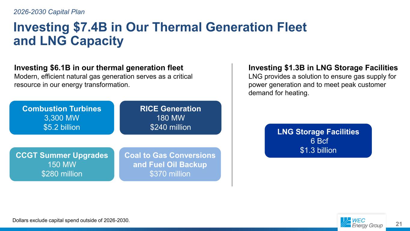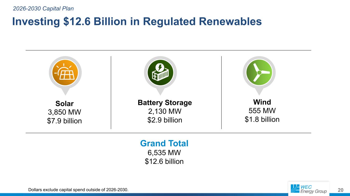 19 Diverse Portfolio of Businesses 63% 14% 4% 9% 10% WI IL MI/MN WECI ATC* By Jurisdiction By Business Based on average asset base. *ATC is accounted for using the equity method; this represents WEC Energy Group’s portion of the asset base. 2030E Asset base $59.6 billion2025A Asset base $34.2 billion 11.7% CAGR 58% 23% 5% 4% 10% 49% 30% 2% 9% 10% 58% non-VLC/bespoke 15% VLC/bespoke 10% 3% 4% 10% 73% Total WI Electric generation and distribution Natural gas distribution LNG (distribution and generation) WECI Electric transmission*