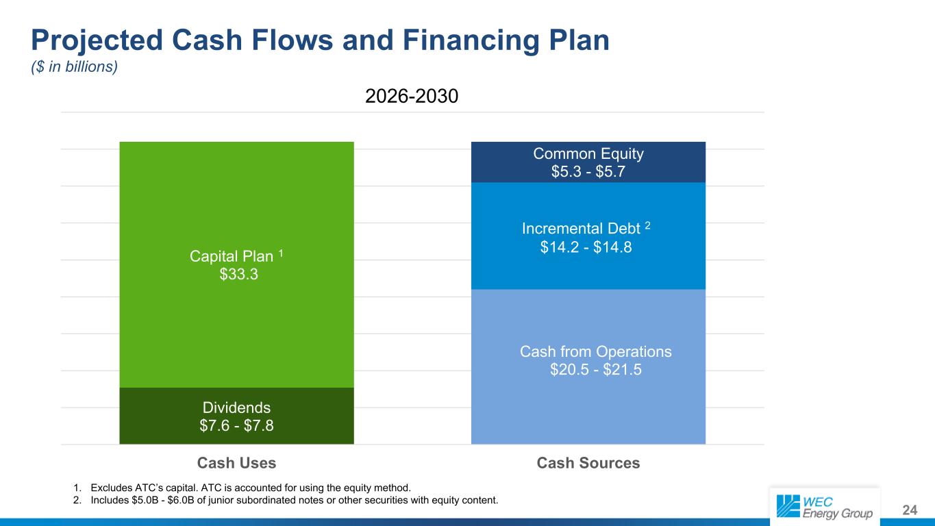 24 Projected Cash Flows and Financing Plan ($ in billions) Cash from Operations $20.5 - $21.5 Common Equity $5.3 - $5.7 Dividends $7.6 - $7.8 Capital Plan 1 $33.3 Cash Uses Cash Sources Incremental Debt 2 $14.2 - $14.8 1. Excludes ATC’s capital. ATC is accounted for using the equity method. 2. Includes $5.0B - $6.0B of junior subordinated notes or other securities with equity content. 2026-2030