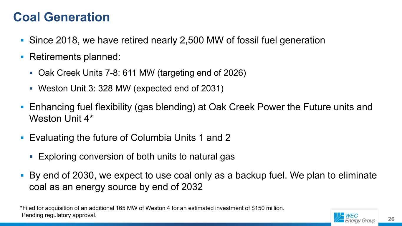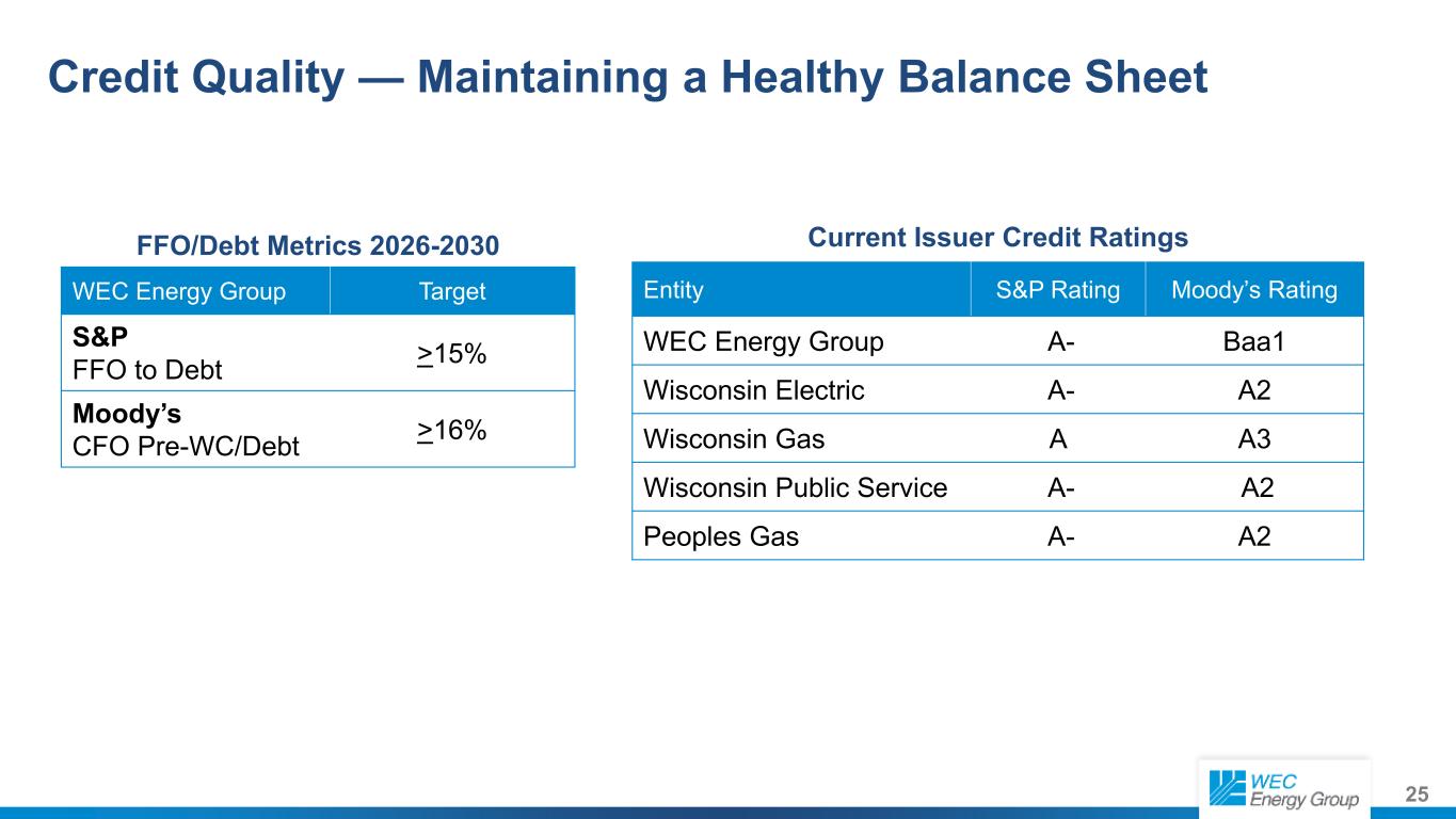 25 Credit Quality — Maintaining a Healthy Balance Sheet Current Issuer Credit Ratings Entity S&P Rating Moody’s Rating WEC Energy Group A- Baa1 Wisconsin Electric A- A2 Wisconsin Gas A A3 Wisconsin Public Service A- A2 Peoples Gas A- A2 FFO/Debt Metrics 2026-2030 WEC Energy Group Target S&P FFO to Debt >15% Moody’s CFO Pre-WC/Debt >16%