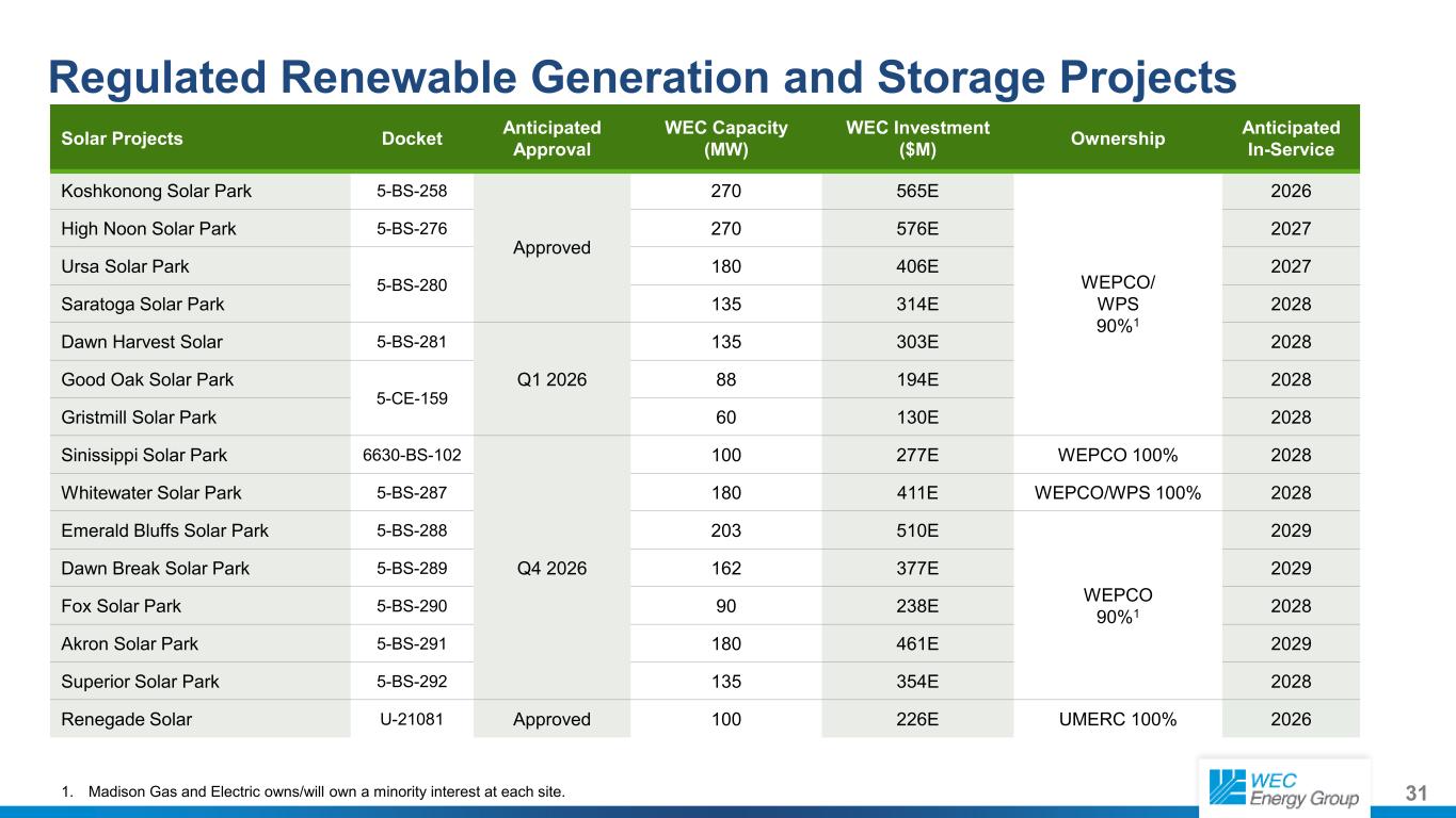 31 Solar Projects Docket Anticipated Approval WEC Capacity (MW) WEC Investment ($M) Ownership Anticipated In-Service Koshkonong Solar Park 5-BS-258 Approved 270 565E WEPCO/ WPS 90%1 2026 High Noon Solar Park 5-BS-276 270 576E 2027 Ursa Solar Park 5-BS-280 180 406E 2027 Saratoga Solar Park 135 314E 2028 Dawn Harvest Solar 5-BS-281 Q1 2026 135 303E 2028 Good Oak Solar Park 5-CE-159 88 194E 2028 Gristmill Solar Park 60 130E 2028 Sinissippi Solar Park 6630-BS-102 Q4 2026 100 277E WEPCO 100% 2028 Whitewater Solar Park 5-BS-287 180 411E WEPCO/WPS 100% 2028 Emerald Bluffs Solar Park 5-BS-288 203 510E WEPCO 90%1 2029 Dawn Break Solar Park 5-BS-289 162 377E 2029 Fox Solar Park 5-BS-290 90 238E 2028 Akron Solar Park 5-BS-291 180 461E 2029 Superior Solar Park 5-BS-292 135 354E 2028 Renegade Solar U-21081 Approved 100 226E UMERC 100% 2026 Regulated Renewable Generation and Storage Projects 1. Madison Gas and Electric owns/will own a minority interest at each site.