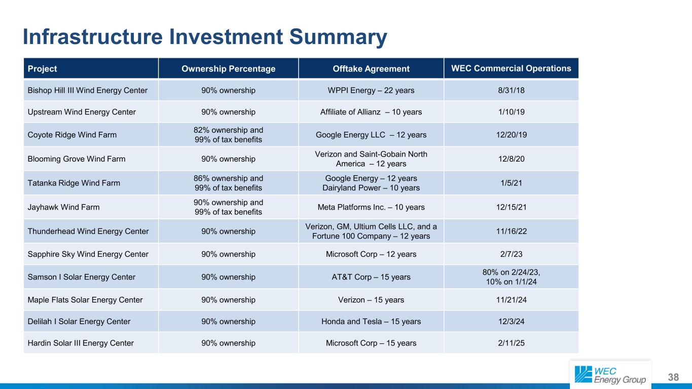38 Project Ownership Percentage Offtake Agreement WEC Commercial Operations Bishop Hill III Wind Energy Center 90% ownership WPPI Energy – 22 years 8/31/18 Upstream Wind Energy Center 90% ownership Affiliate of Allianz – 10 years 1/10/19 Coyote Ridge Wind Farm 82% ownership and 99% of tax benefits Google Energy LLC – 12 years 12/20/19 Blooming Grove Wind Farm 90% ownership Verizon and Saint-Gobain North America – 12 years 12/8/20 Tatanka Ridge Wind Farm 86% ownership and 99% of tax benefits Google Energy – 12 years Dairyland Power – 10 years 1/5/21 Jayhawk Wind Farm 90% ownership and 99% of tax benefits Meta Platforms Inc. – 10 years 12/15/21 Thunderhead Wind Energy Center 90% ownership Verizon, GM, Ultium Cells LLC, and a Fortune 100 Company – 12 years 11/16/22 Sapphire Sky Wind Energy Center 90% ownership Microsoft Corp – 12 years 2/7/23 Samson I Solar Energy Center 90% ownership AT&T Corp – 15 years 80% on 2/24/23, 10% on 1/1/24 Maple Flats Solar Energy Center 90% ownership Verizon – 15 years 11/21/24 Delilah I Solar Energy Center 90% ownership Honda and Tesla – 15 years 12/3/24 Hardin Solar III Energy Center 90% ownership Microsoft Corp – 15 years 2/11/25 Infrastructure Investment Summary