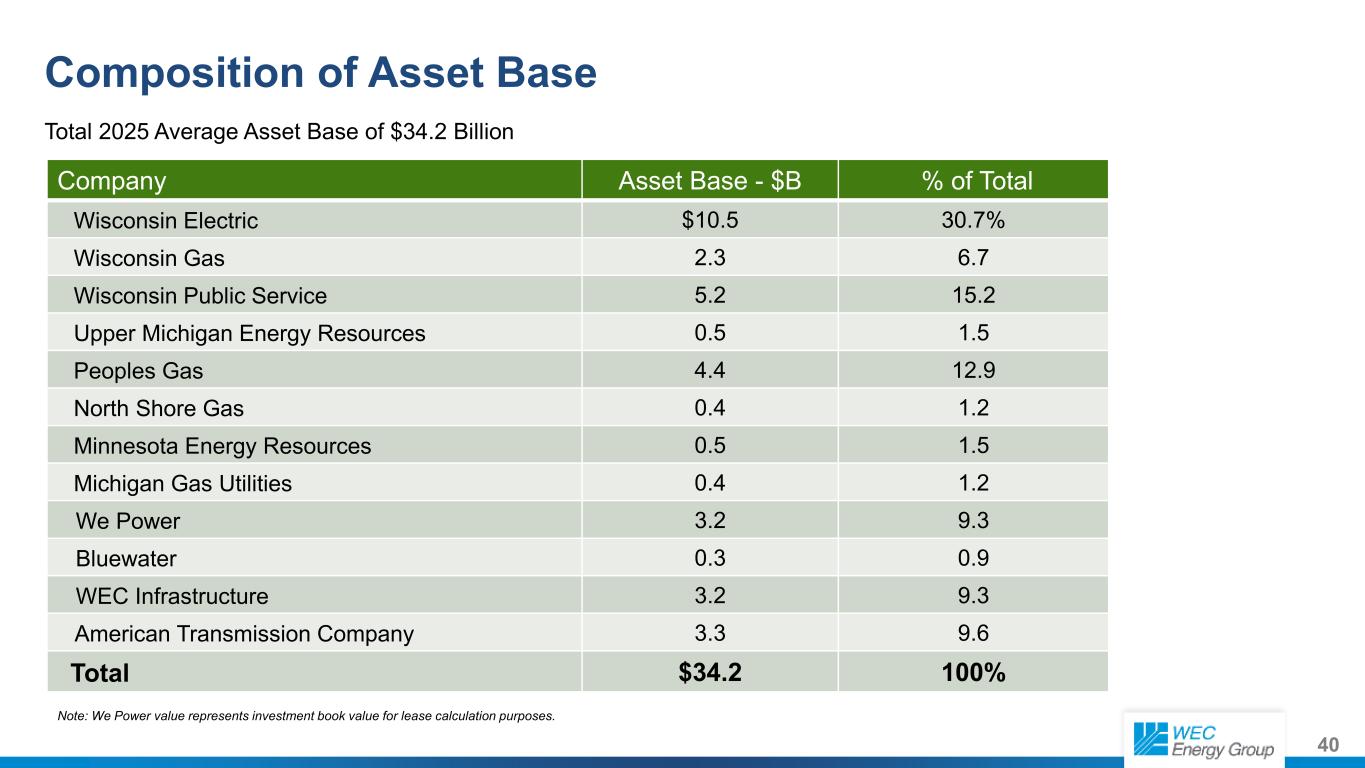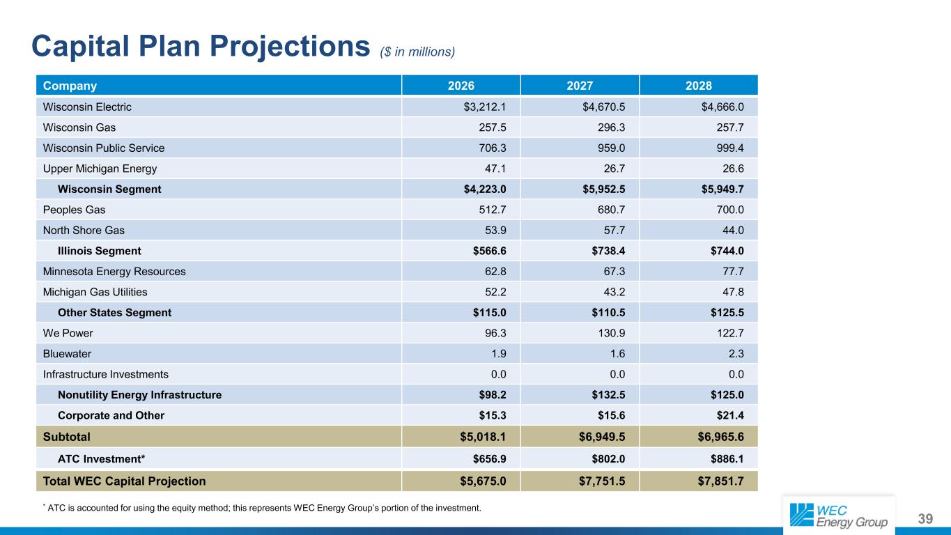 39 Company 2026 2027 2028 Wisconsin Electric $3,212.1 $4,670.5 $4,666.0 Wisconsin Gas 257.5 296.3 257.7 Wisconsin Public Service 706.3 959.0 999.4 Upper Michigan Energy 47.1 26.7 26.6 Wisconsin Segment $4,223.0 $5,952.5 $5,949.7 Peoples Gas 512.7 680.7 700.0 North Shore Gas 53.9 57.7 44.0 Illinois Segment $566.6 $738.4 $744.0 Minnesota Energy Resources 62.8 67.3 77.7 Michigan Gas Utilities 52.2 43.2 47.8 Other States Segment $115.0 $110.5 $125.5 We Power 96.3 130.9 122.7 Bluewater 1.9 1.6 2.3 Infrastructure Investments 0.0 0.0 0.0 Nonutility Energy Infrastructure $98.2 $132.5 $125.0 Corporate and Other $15.3 $15.6 $21.4 Subtotal $5,018.1 $6,949.5 $6,965.6 ATC Investment* $656.9 $802.0 $886.1 Total WEC Capital Projection $5,675.0 $7,751.5 $7,851.7 Capital Plan Projections ($ in millions) * ATC is accounted for using the equity method; this represents WEC Energy Group’s portion of the investment.
