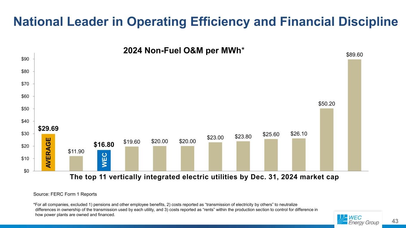 43 National Leader in Operating Efficiency and Financial Discipline $29.69 $11.90 $16.80 $19.60 $20.00 $20.00 $23.00 $23.80 $25.60 $26.10 $50.20 $89.60 $0 $10 $20 $30 $40 $50 $60 $70 $80 $90 2024 Non-Fuel O&M per MWh* Source: FERC Form 1 Reports *For all companies, excluded 1) pensions and other employee benefits, 2) costs reported as “transmission of electricity by others” to neutralize differences in ownership of the transmission used by each utility, and 3) costs reported as “rents” within the production section to control for difference in how power plants are owned and financed. The top 11 vertically integrated electric utilities by Dec. 31, 2024 market cap W E C A V E R A G E