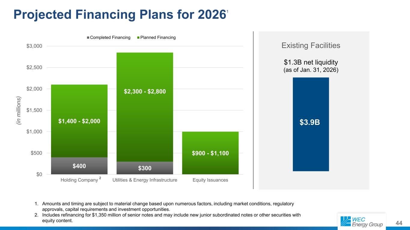 44 Projected Financing Plans for 20261 $400 $300 $1,400 - $2,000 $2,300 - $2,800 $900 - $1,100 $0 $500 $1,000 $1,500 $2,000 $2,500 $3,000 Holding Company Utilities & Energy Infrastructure Equity Issuances (i n m ill io n s ) Completed Financing Planned Financing Existing Facilities $1.3B net liquidity (as of Jan. 31, 2026) $3.9B 2 1. Amounts and timing are subject to material change based upon numerous factors, including market conditions, regulatory approvals, capital requirements and investment opportunities. 2. Includes refinancing for $1,350 million of senior notes and may include new junior subordinated notes or other securities with equity content.