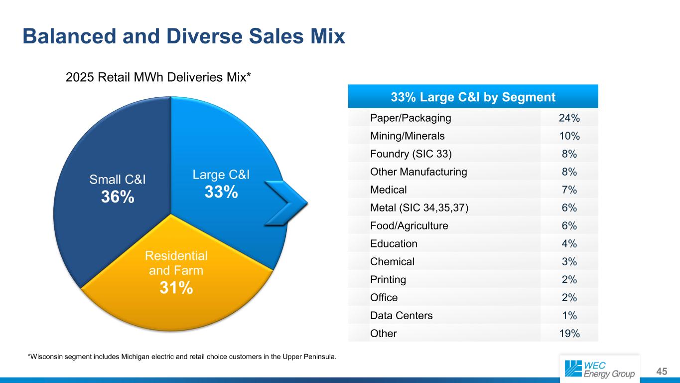 45 33% Large C&I by Segment Paper/Packaging 24% Mining/Minerals 10% Foundry (SIC 33) 8% Other Manufacturing 8% Medical 7% Metal (SIC 34,35,37) 6% Food/Agriculture 6% Education 4% Chemical 3% Printing 2% Office 2% Data Centers 1% Other 19% Balanced and Diverse Sales Mix Large C&I 33% Residential and Farm 31% Small C&I 36% 2025 Retail MWh Deliveries Mix* *Wisconsin segment includes Michigan electric and retail choice customers in the Upper Peninsula.