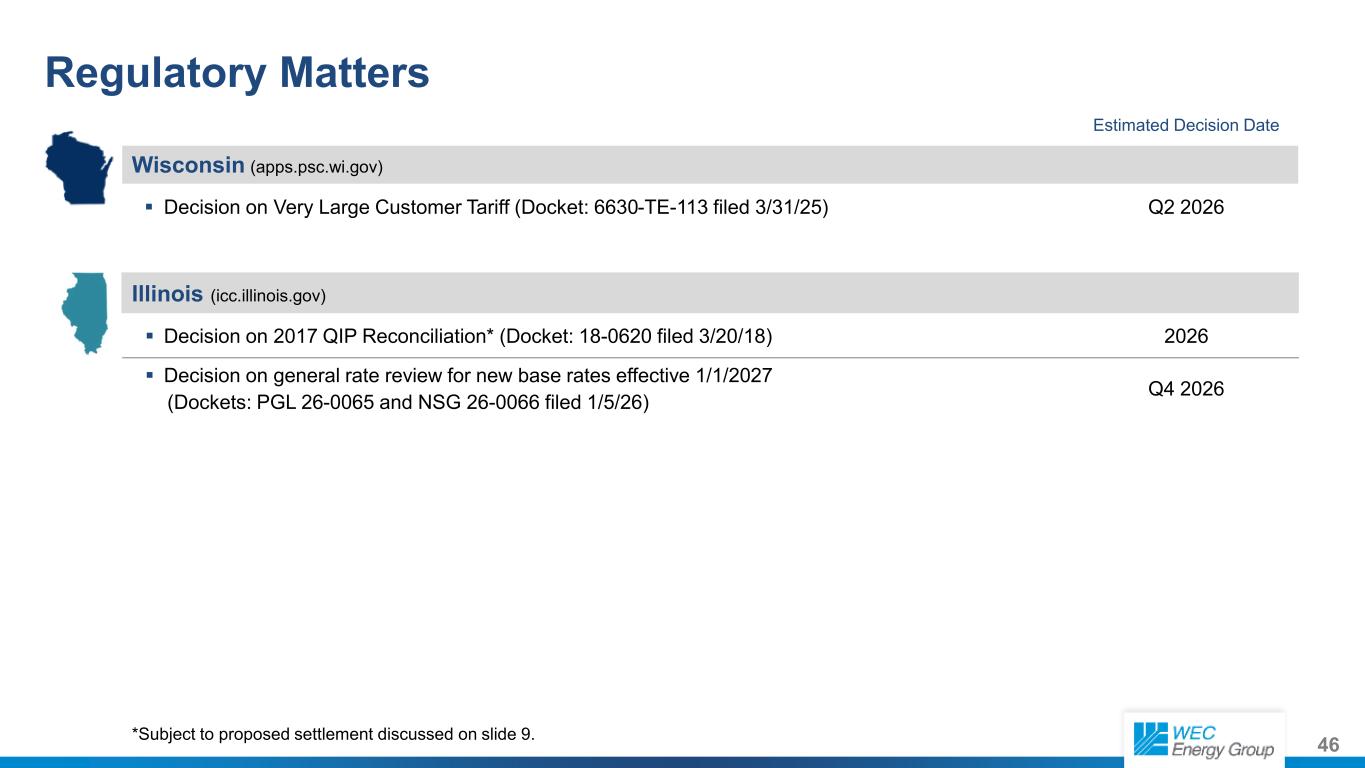 46 Estimated Decision Date Wisconsin (apps.psc.wi.gov) ▪ Decision on Very Large Customer Tariff (Docket: 6630-TE-113 filed 3/31/25) Q2 2026 Illinois (icc.illinois.gov) ▪ Decision on 2017 QIP Reconciliation* (Docket: 18-0620 filed 3/20/18) 2026 ▪ Decision on general rate review for new base rates effective 1/1/2027 (Dockets: PGL 26-0065 and NSG 26-0066 filed 1/5/26) Q4 2026 Regulatory Matters *Subject to proposed settlement discussed on slide 9.