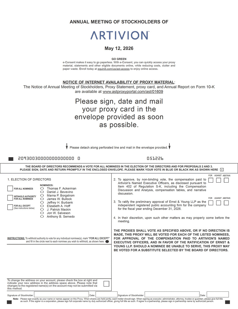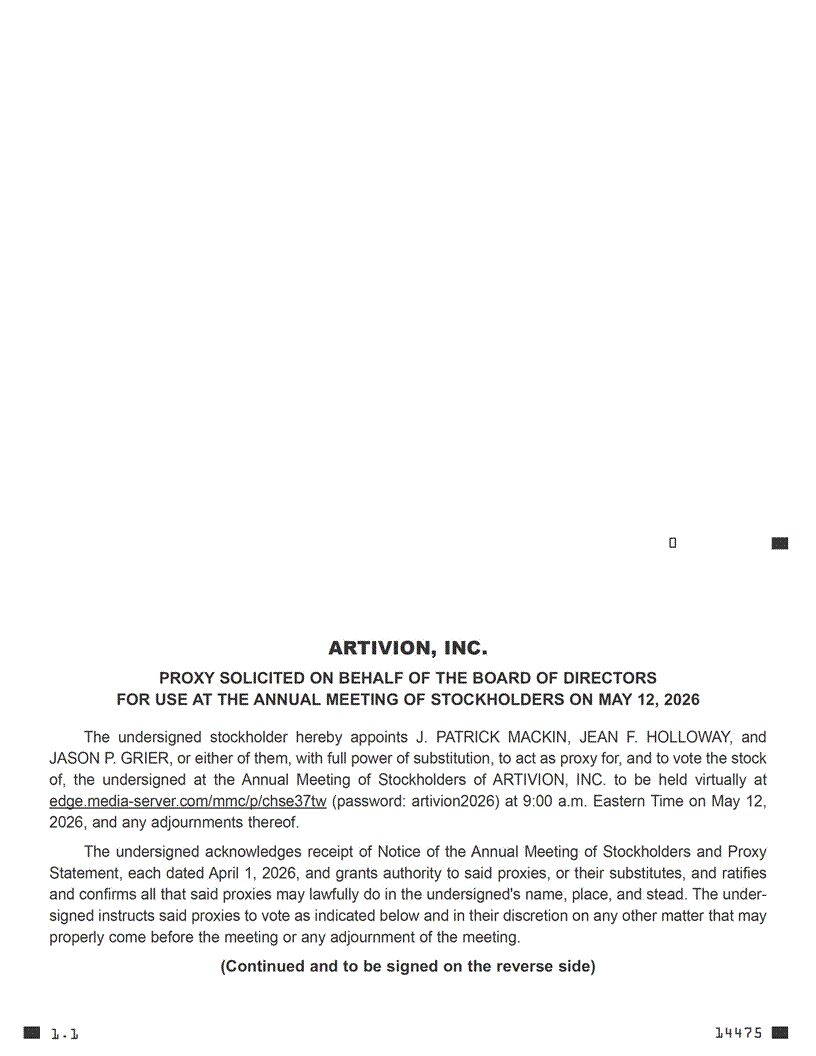 ARTIVION, INC. PROXY SOLICITED ON BEHALF OF THE BOARD OF DIRECTORS FOR USE AT THE ANNUAL MEETING OF STOCKHOLDERS ON MAY 12, 2026 The undersigned stockholder hereby appoints J. PATRICK MACKIN, JEAN F. HOLLOWAY, and JASON P. GRIER, or either of them, with full power of substitution, to act as proxy for, and to vote the stock of, the undersigned at the Annual Meeting of Stockholders of ARTIVION, INC. to be held virtually at edge.media-server.com/mmc/p/chse37tw (password: artivion2026) at 9:00 a.m. Eastern Time on May 12, 2026, and any adjournments thereof. The undersigned acknowledges receipt of Notice of the Annual Meeting of Stockholders and Proxy Statement, each dated April 1, 2026, and grants authority to said proxies, or their substitutes, and ratifies and confirms all that said proxies may lawfully do in the undersigned's name, place, and stead. The under signed instructs said proxies to vote as indicated below and in their discretion on any other matter that may properly come before the meeting or any adjournment of the meeting. (Continued and to be signed on the reverse side) 1.1 14475