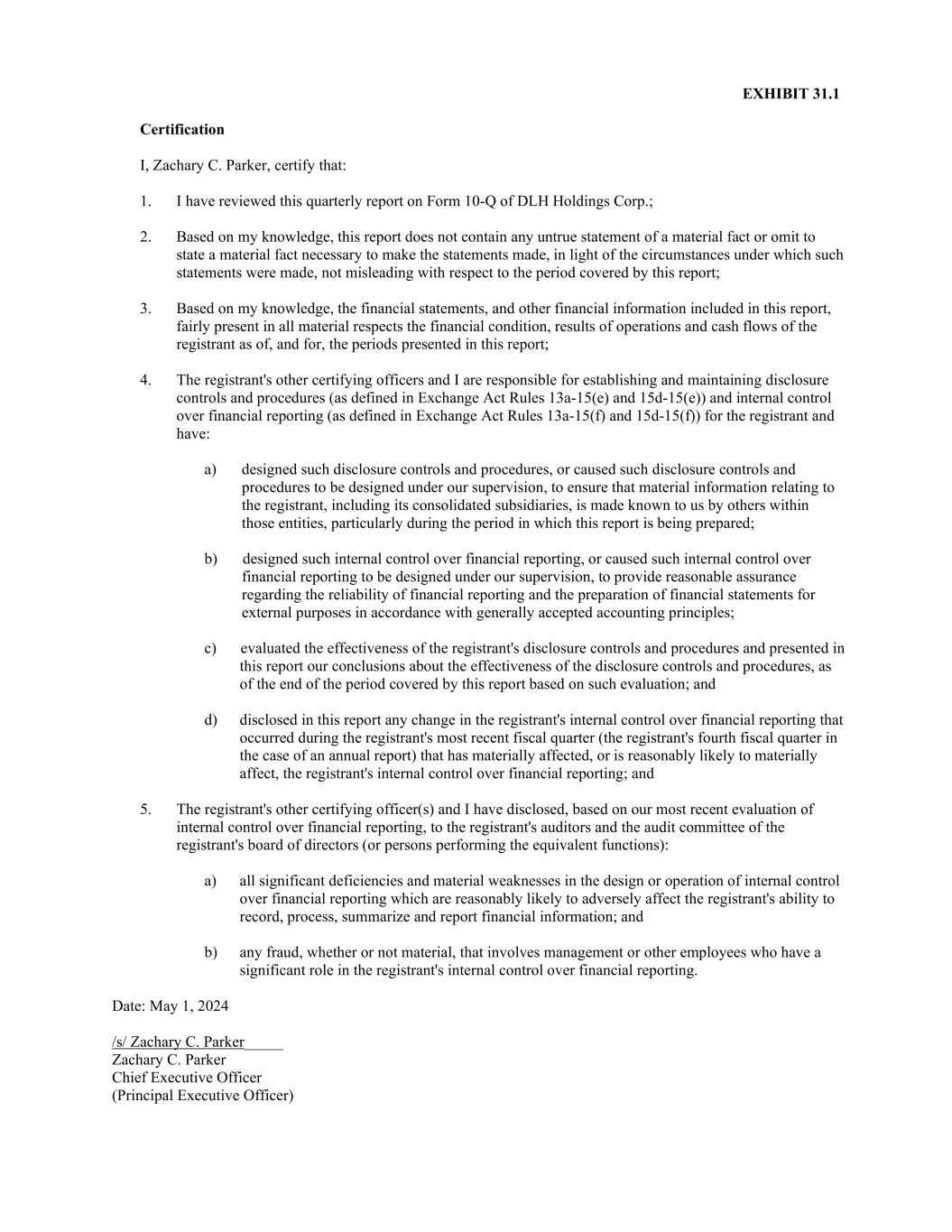 EXHIBIT 31.1 Certification I, Zachary C. Parker, certify that: 1. I have reviewed this quarterly report on Form 10-Q of DLH Holdings Corp.; 2. Based on my knowledge, this report does not contain any untrue statement of a material fact or omit to state a material fact necessary to make the statements made, in light of the circumstances under which such statements were made, not misleading with respect to the period covered by this report; 3. Based on my knowledge, the financial statements, and other financial information included in this report, fairly present in all material respects the financial condition, results of operations and cash flows of the registrant as of, and for, the periods presented in this report; 4. The registrant's other certifying officers and I are responsible for establishing and maintaining disclosure controls and procedures (as defined in Exchange Act Rules 13a-15(e) and 15d-15(e)) and internal control over financial reporting (as defined in Exchange Act Rules 13a-15(f) and 15d-15(f)) for the registrant and have: a) designed such disclosure controls and procedures, or caused such disclosure controls and procedures to be designed under our supervision, to ensure that material information relating to the registrant, including its consolidated subsidiaries, is made known to us by others within those entities, particularly during the period in which this report is being prepared; b) designed such internal control over financial reporting, or caused such internal control over financial reporting to be designed under our supervision, to provide reasonable assurance regarding the reliability of financial reporting and the preparation of financial statements for external purposes in accordance with generally accepted accounting principles; c) evaluated the effectiveness of the registrant's disclosure controls and procedures and presented in this report our conclusions about the effectiveness of the disclosure controls and procedures, as of the end of the period covered by this report based on such evaluation; and d) disclosed in this report any change in the registrant's internal control over financial reporting that occurred during the registrant's most recent fiscal quarter (the registrant's fourth fiscal quarter in the case of an annual report) that has materially affected, or is reasonably likely to materially affect, the registrant's internal control over financial reporting; and 5. The registrant's other certifying officer(s) and I have disclosed, based on our most recent evaluation of internal control over financial reporting, to the registrant's auditors and the audit committee of the registrant's board of directors (or persons performing the equivalent functions): a) all significant deficiencies and material weaknesses in the design or operation of internal control over financial reporting which are reasonably likely to adversely affect the registrant's ability to record, process, summarize and report financial information; and b) any fraud, whether or not material, that involves management or other employees who have a significant role in the registrant's internal control over financial reporting. Date: May 1, 2024 /s/ Zachary C. Parker_____ Zachary C. Parker Chief Executive Officer (Principal Executive Officer)