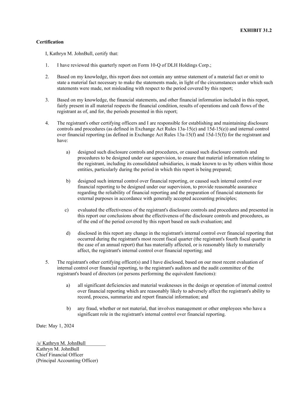 EXHIBIT 31.2 Certification I, Kathryn M. JohnBull, certify that: 1. I have reviewed this quarterly report on Form 10-Q of DLH Holdings Corp.; 2. Based on my knowledge, this report does not contain any untrue statement of a material fact or omit to state a material fact necessary to make the statements made, in light of the circumstances under which such statements were made, not misleading with respect to the period covered by this report; 3. Based on my knowledge, the financial statements, and other financial information included in this report, fairly present in all material respects the financial condition, results of operations and cash flows of the registrant as of, and for, the periods presented in this report; 4. The registrant's other certifying officers and I are responsible for establishing and maintaining disclosure controls and procedures (as defined in Exchange Act Rules 13a-15(e) and 15d-15(e)) and internal control over financial reporting (as defined in Exchange Act Rules 13a-15(f) and 15d-15(f)) for the registrant and have: a) designed such disclosure controls and procedures, or caused such disclosure controls and procedures to be designed under our supervision, to ensure that material information relating to the registrant, including its consolidated subsidiaries, is made known to us by others within those entities, particularly during the period in which this report is being prepared; b) designed such internal control over financial reporting, or caused such internal control over financial reporting to be designed under our supervision, to provide reasonable assurance regarding the reliability of financial reporting and the preparation of financial statements for external purposes in accordance with generally accepted accounting principles; c) evaluated the effectiveness of the registrant's disclosure controls and procedures and presented in this report our conclusions about the effectiveness of the disclosure controls and procedures, as of the end of the period covered by this report based on such evaluation; and d) disclosed in this report any change in the registrant's internal control over financial reporting that occurred during the registrant's most recent fiscal quarter (the registrant's fourth fiscal quarter in the case of an annual report) that has materially affected, or is reasonably likely to materially affect, the registrant's internal control over financial reporting; and 5. The registrant's other certifying officer(s) and I have disclosed, based on our most recent evaluation of internal control over financial reporting, to the registrant's auditors and the audit committee of the registrant's board of directors (or persons performing the equivalent functions): a) all significant deficiencies and material weaknesses in the design or operation of internal control over financial reporting which are reasonably likely to adversely affect the registrant's ability to record, process, summarize and report financial information; and b) any fraud, whether or not material, that involves management or other employees who have a significant role in the registrant's internal control over financial reporting. Date: May 1, 2024 /s/ Kathryn M. JohnBull________ Kathryn M. JohnBull Chief Financial Officer (Principal Accounting Officer)