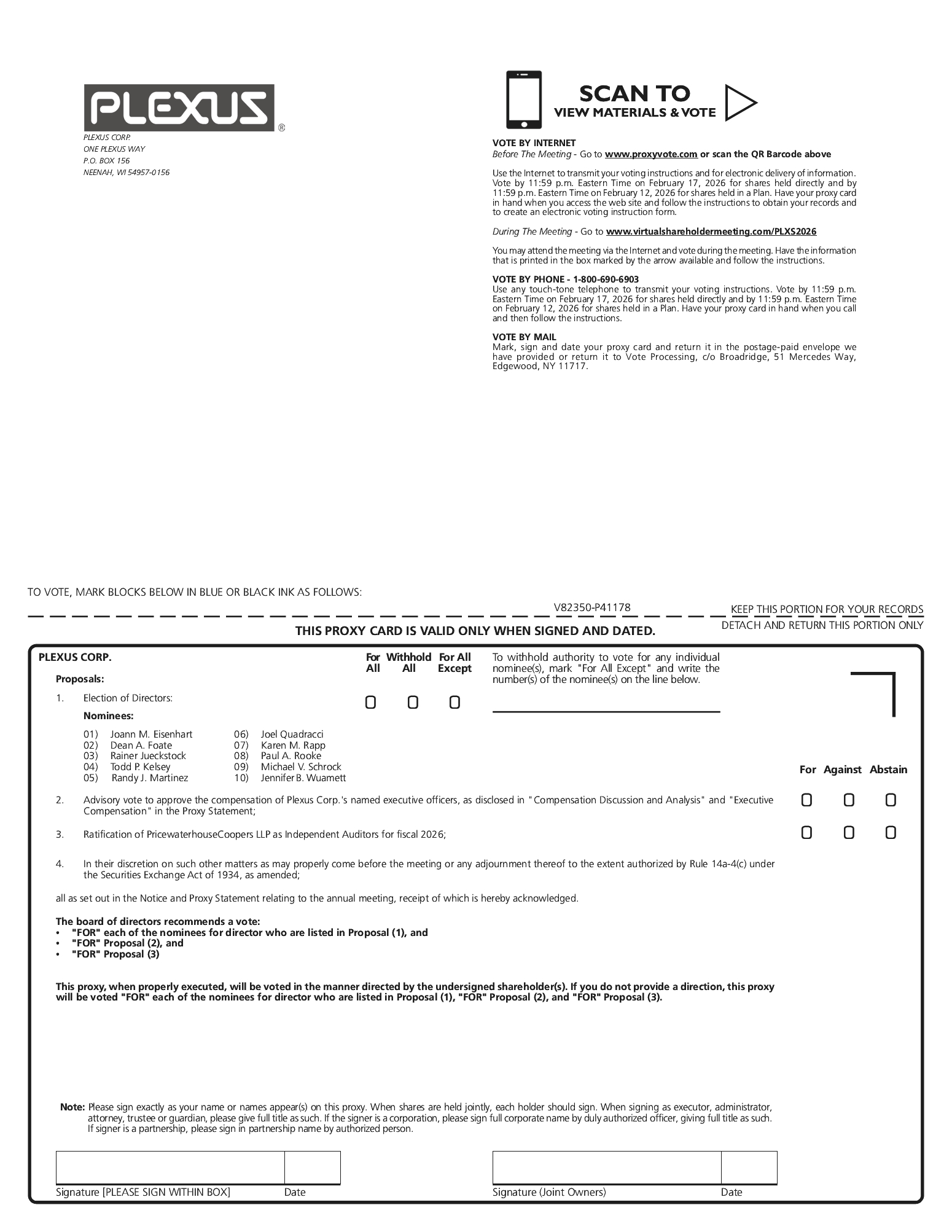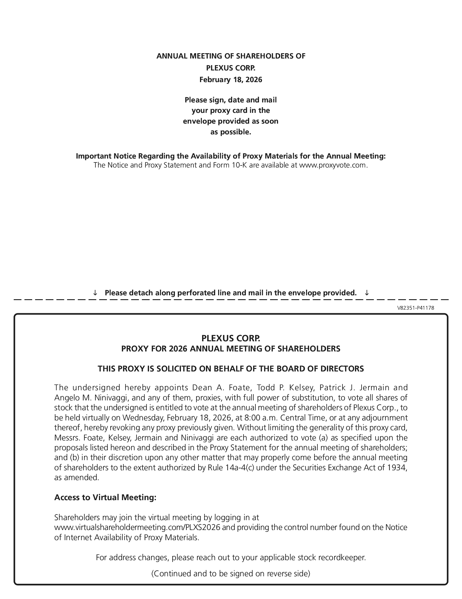 Plexus has change in control agreements with its executive officers and certain other key employees. Under the terms of these agreements, if there is a change in control of Plexus, as defined in the agreement, the executive officers’ authorities, duties and responsibilities shall remain at least commensurate in all material respects with those prior to the change in control. Their compensation may not be reduced, their benefits must be commensurate with those of similarly situated executives of the acquiring firm and their location of employment must not be changed significantly as a result of the change in control.
