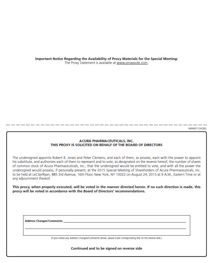 Acura Pharmaceuticals, Inc, (the “Company”) is filing the attached proxy card to amend the proxy card in the Proxy Statement that was originally filed on July 14, 2015 to correct a typographical error in the proxy card. The proxy materials delivered to the Company’s shareholders will include the attached proxy card. Other than this change to the proxy card, the Proxy Statement remains unchanged.