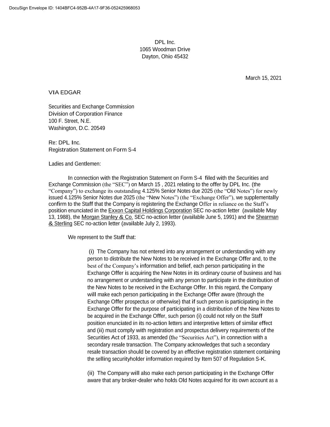 DPL Inc. 1065 Woodman Drive Dayton, Ohio 45432 March 15, 2021 VIA EDGAR Securities and Exchange Commission Division of Corporation Finance 100 F. Street, N.E. Washington, D.C. 20549 Re: DPL Inc. Registration Statement on Form S-4 Ladies and Gentlemen: In connection with the Registration Statement on Form S-4 filed with the Securities and Exchange Commission (the “SEC”) on March 15 , 2021 relating to the offer by DPL Inc. (the “Company”) to exchange its outstanding 4.125% Senior Notes due 2025 (the “Old Notes”) for newly issued 4.125% Senior Notes due 2025 (the “New Notes”) (the “Exchange Offer”), we supplementally confirm to the Staff that the Company is registering the Exchange Offer in reliance on the Staff’s position enunciated in the Exxon Capital Holdings Corporation SEC no-action letter (available May 13, 1988), the Morgan Stanley & Co. SEC no-action letter (available June 5, 1991) and the Shearman & Sterling SEC no-action letter (available July 2, 1993). We represent to the Staff that: (i) The Company has not entered into any arrangement or understanding with any person to distribute the New Notes to be received in the Exchange Offer and, to the best of the Company’s information and belief, each person participating in the Exchange Offer is acquiring the New Notes in its ordinary course of business and has no arrangement or understanding with any person to participate in the distribution of the New Notes to be received in the Exchange Offer. In this regard, the Company will make each person participating in the Exchange Offer aware (through the Exchange Offer prospectus or otherwise) that if such person is participating in the Exchange Offer for the purpose of participating in a distribution of the New Notes to be acquired in the Exchange Offer, such person (i) could not rely on the Staff position enunciated in its no-action letters and interpretive letters of similar effect and (ii) must comply with registration and prospectus delivery requirements of the Securities Act of 1933, as amended (the “Securities Act”), in connection with a secondary resale transaction. The Company acknowledges that such a secondary resale transaction should be covered by an effective registration statement containing the selling securityholder information required by Item 507 of Regulation S-K. (ii) The Company will also make each person participating in the Exchange Offer aware that any broker-dealer who holds Old Notes acquired for its own account as a DocuSign Envelope ID: 1404BFC4-952B-4A17-9F36-052425968053
