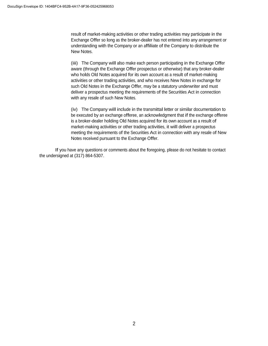 2 result of market-making activities or other trading activities may participate in the Exchange Offer so long as the broker-dealer has not entered into any arrangement or understanding with the Company or an affiliate of the Company to distribute the New Notes. (iii) The Company will also make each person participating in the Exchange Offer aware (through the Exchange Offer prospectus or otherwise) that any broker-dealer who holds Old Notes acquired for its own account as a result of market-making activities or other trading activities, and who receives New Notes in exchange for such Old Notes in the Exchange Offer, may be a statutory underwriter and must deliver a prospectus meeting the requirements of the Securities Act in connection with any resale of such New Notes. (iv) The Company will include in the transmittal letter or similar documentation to be executed by an exchange offeree, an acknowledgment that if the exchange offeree is a broker-dealer holding Old Notes acquired for its own account as a result of market-making activities or other trading activities, it will deliver a prospectus meeting the requirements of the Securities Act in connection with any resale of New Notes received pursuant to the Exchange Offer. If you have any questions or comments about the foregoing, please do not hesitate to contact the undersigned at (317) 864-5307. DocuSign Envelope ID: 1404BFC4-952B-4A17-9F36-052425968053
