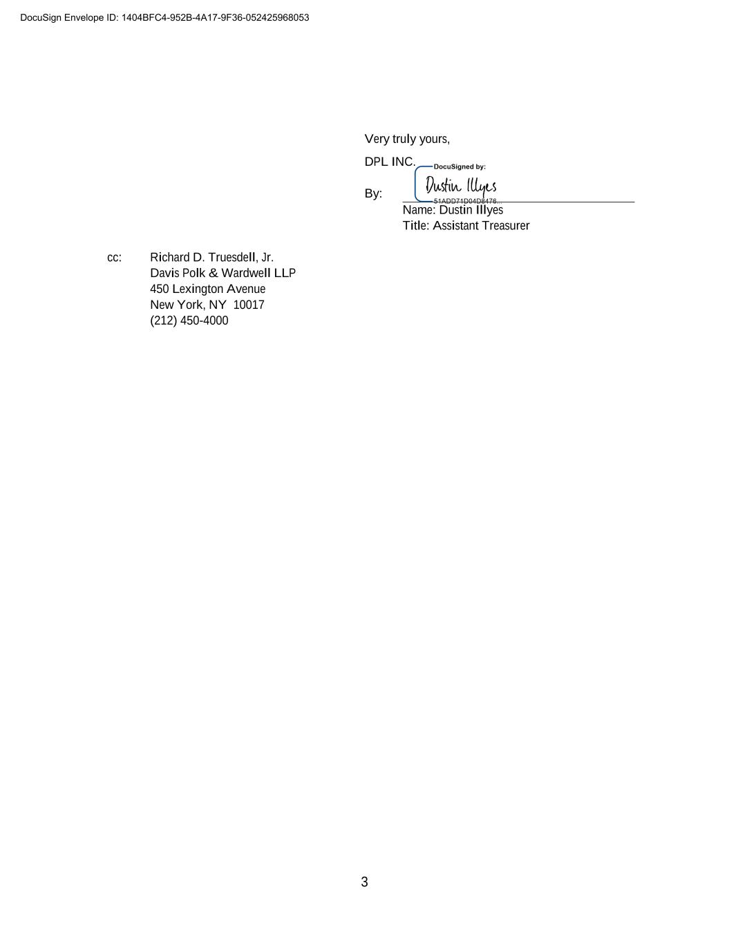 3 Very truly yours, DPL INC. By: Name: Dustin Illyes Title: Assistant Treasurer cc: Richard D. Truesdell, Jr. Davis Polk & Wardwell LLP 450 Lexington Avenue New York, NY 10017 (212) 450-4000 DocuSign Envelope ID: 1404BFC4-952B-4A17-9F36-052425968053