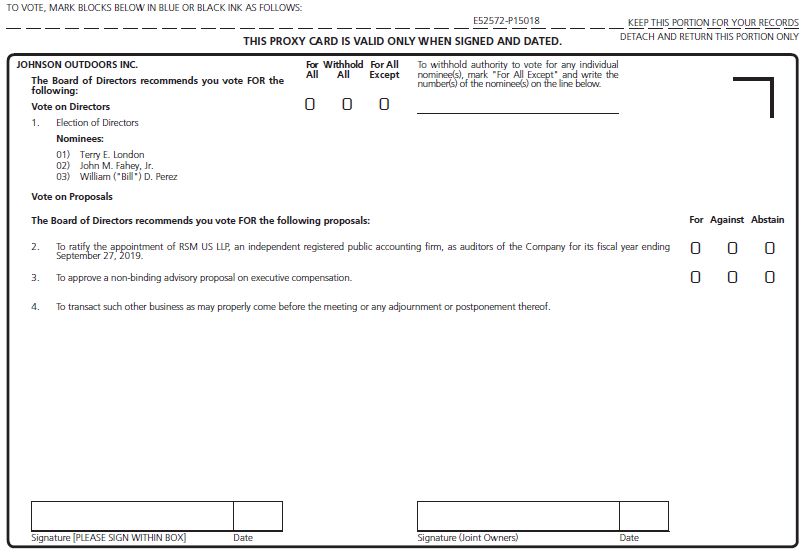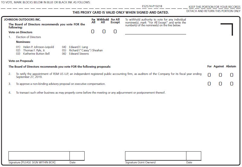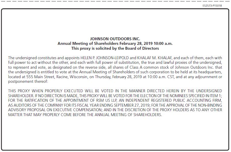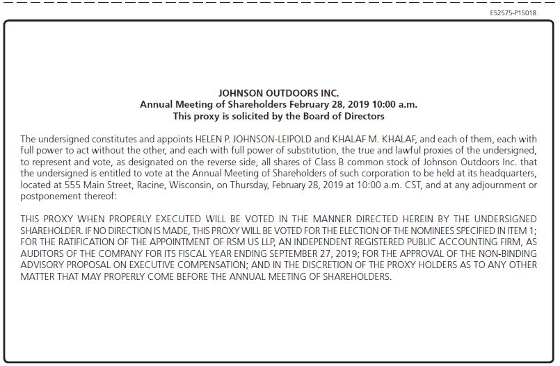 Notice Regarding the Availability of Proxy Materials for the Annual Meeting: The Notice and Proxy Statement and Annual Report on Form 10-K are also available at www.proxyvote.com. E52573-P15018 JOHNSON OUTDOORS INC. Annual Meeting of Shareholders February 28, 2019 10:00