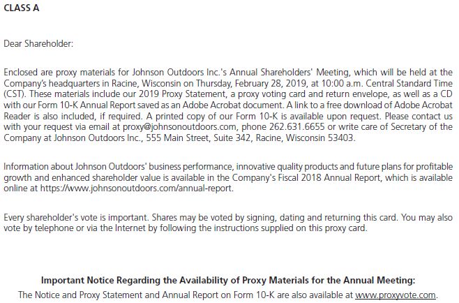CLASS A Dear Shareholder: Enclosed are proxy materials for Johnson Outdoors Inc.’s Annual Shareholders’ Meeting, which will be held at the Company’s headquarters in Racine, Wisconsin on Thursday,