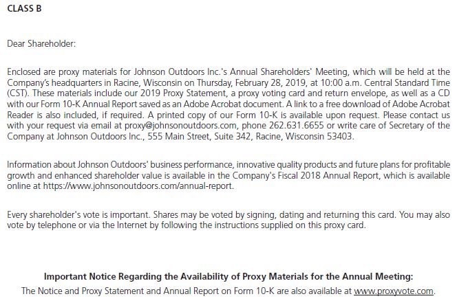 growth and enhanced shareholder value is available in the Company’s Fiscal 2018 Annual Report, which is available online at https://www.johnsonoutdoors.com/annual-report.Every shareholder’s vote is important. Shares may be voted by signing,