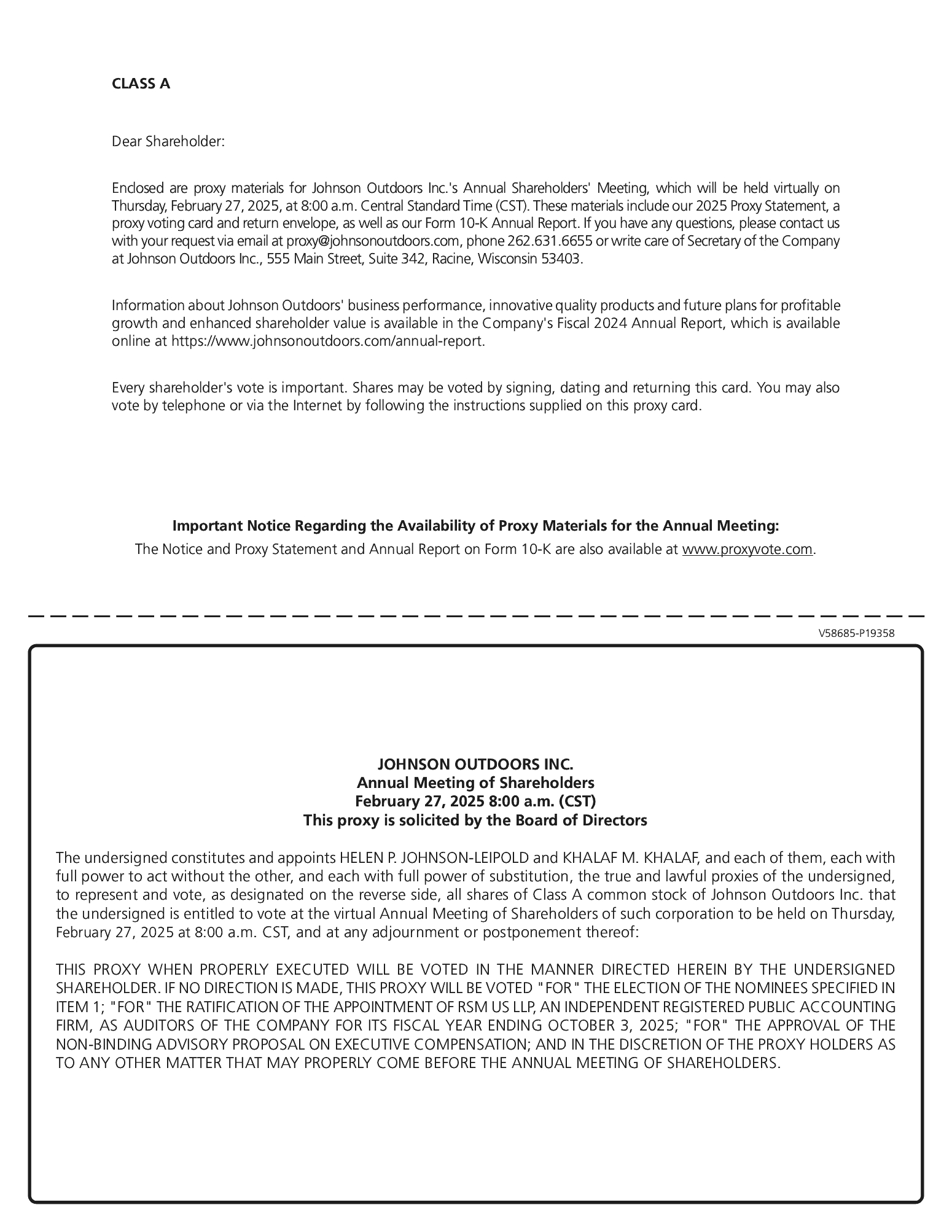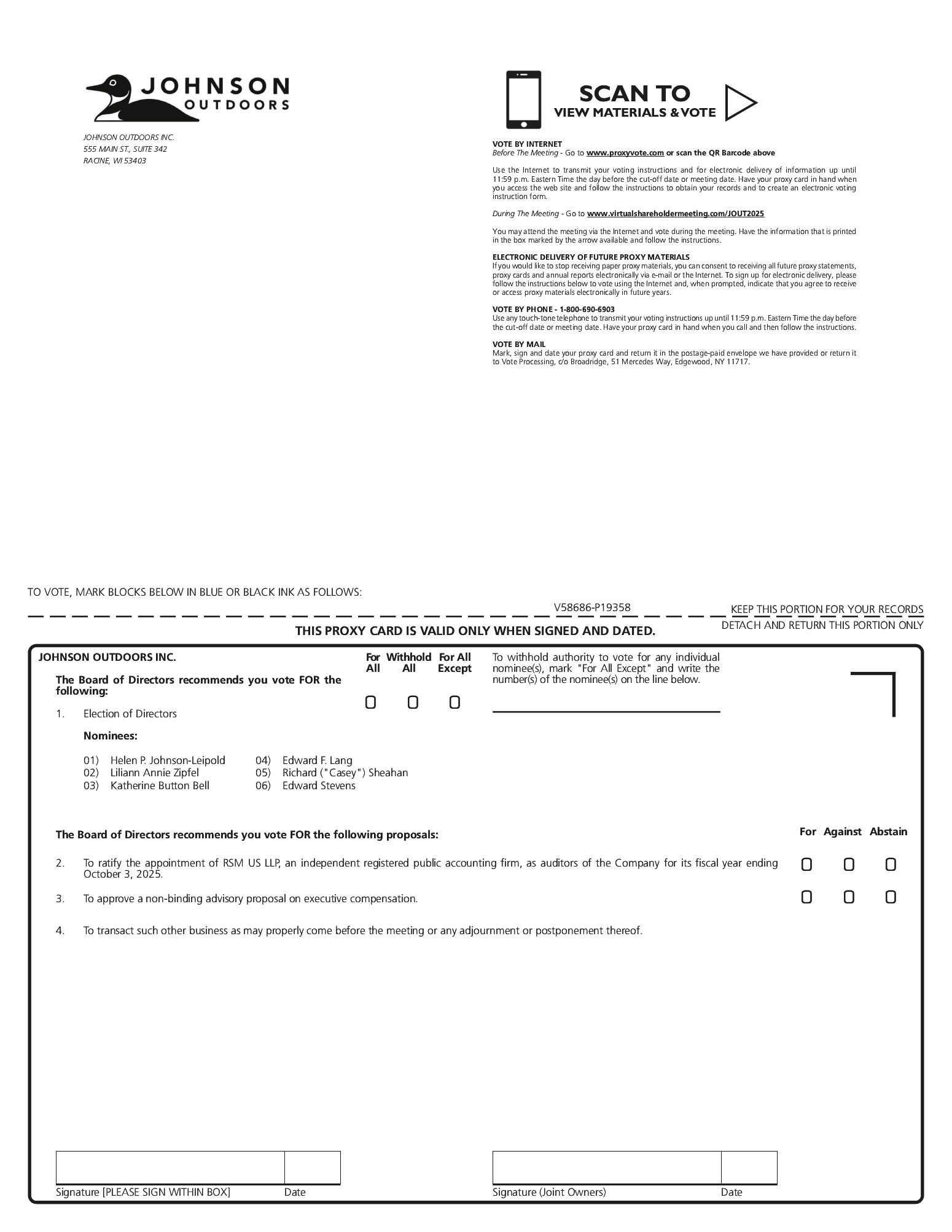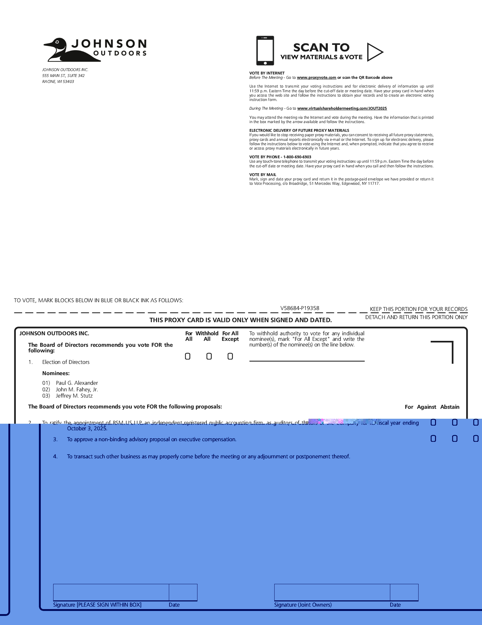 The Company also adopted a Code of Ethics for the Chief Executive Officer and Senior Financial and Accounting Officers (the “Code of Ethics”), which governs the conduct of the Company’s Chief Executive Officer, Chief Financial Officer and its other senior financial and accounting officers and executives. The Code of Ethics supplements the Code of Conduct and is intended to deter wrongdoing and to promote honest and ethical conduct, including the ethical handling of conflicts of interest; provide full, fair, accurate, timely and understandable disclosure in the Company’s public documents; promote compliance with applicable laws and regulations; ensure the prompt reporting of violations of the Code of Ethics; and provide accountability for adherence to the Code of Ethics. The Company has placed a copy of the Code of Ethics on its website located at www.johnsonoutdoors.com. The Company intends to disclose any amendments to, or waivers from, the Code of Ethics on its corporate website.