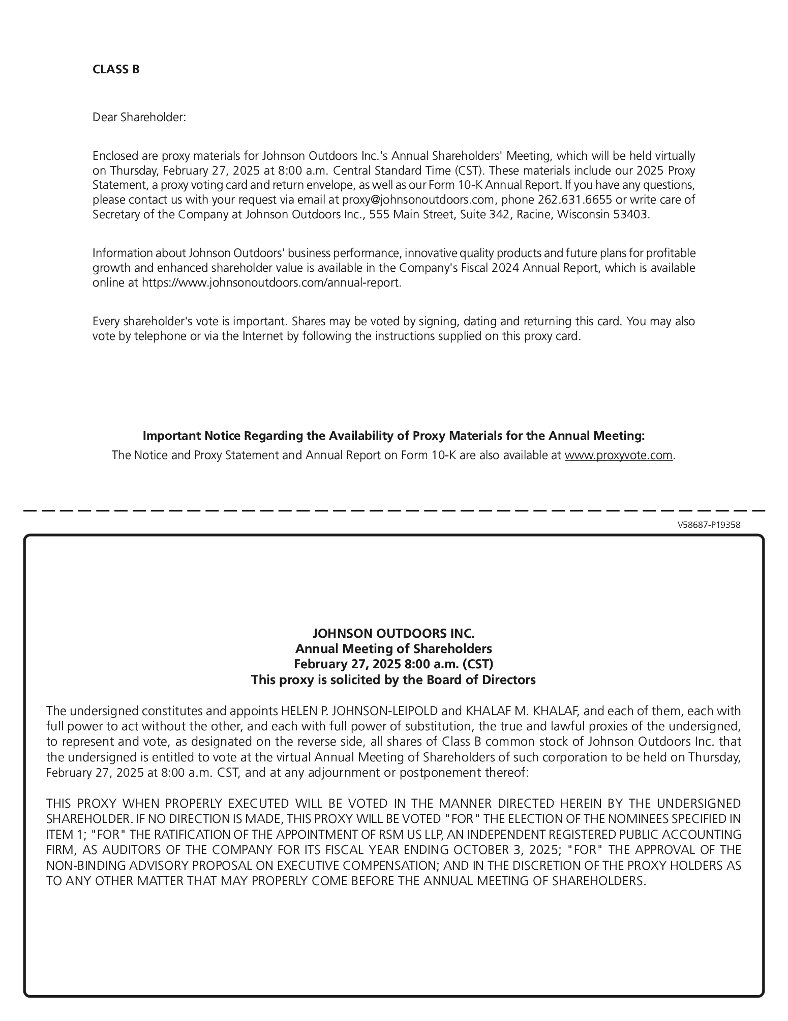 In addition, the Company has adopted a set of Corporate Governance Guidelines (the “Corporate Governance Guidelines”). The Corporate Governance Guidelines have been established to assist the Board of Directors in the exercise of its responsibilities and to reflect the Board’s commitment to monitoring the effectiveness of policy and decision making at both the Board and management levels. The Corporate Governance Guidelines address issues such as composition of the Board, director retirement requirements, independence criteria for Board members, Board leadership, evaluating performance of the Board, directors’ responsibilities, the Board’s relationship with senior management, Committee matters and director continuing education. The Company has placed a copy of the Corporate Governance Guidelines on its website located at www.johnsonoutdoors.com.