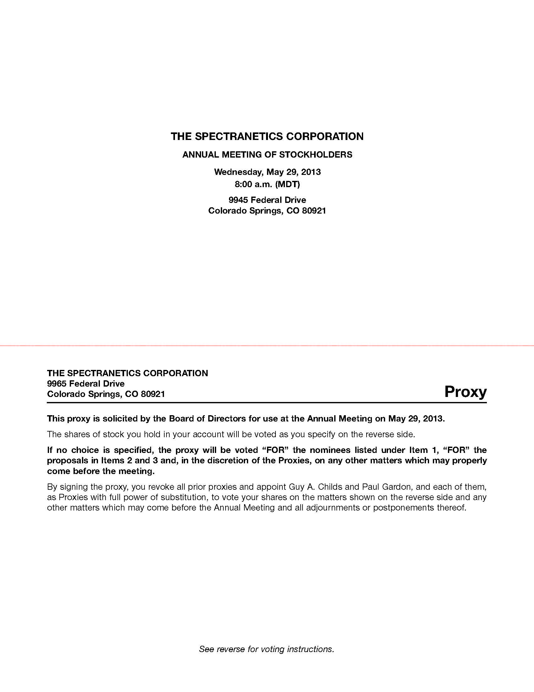 The Annual Meeting of the Stockholders of THE SPECTRANETICS CORPORATION (the “Company”) will be held at 9945 Federal Drive, Colorado Springs, Colorado on May 29, 2013, at 8:00 a.m. (MDT) for the following purposes: