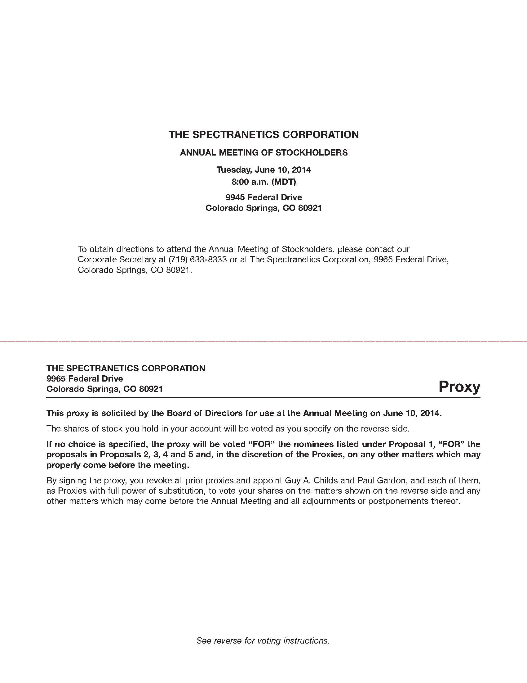 This Proxy Statement is furnished to stockholders of THE SPECTRANETICS CORPORATION (“us,” “we,” “Spectranetics” or the “Company”) to solicit proxies by the Board of Directors (the “Board”) for use at our Annual Meeting of Stockholders (the “Meeting”) to be held at 9945 Federal Drive, Colorado Springs, Colorado, 80921 on June 10, 2014, at 8:00 a.m. (MDT). We expect that this Proxy Statement and proxy will be first mailed to stockholders on or about May 1, 2014.