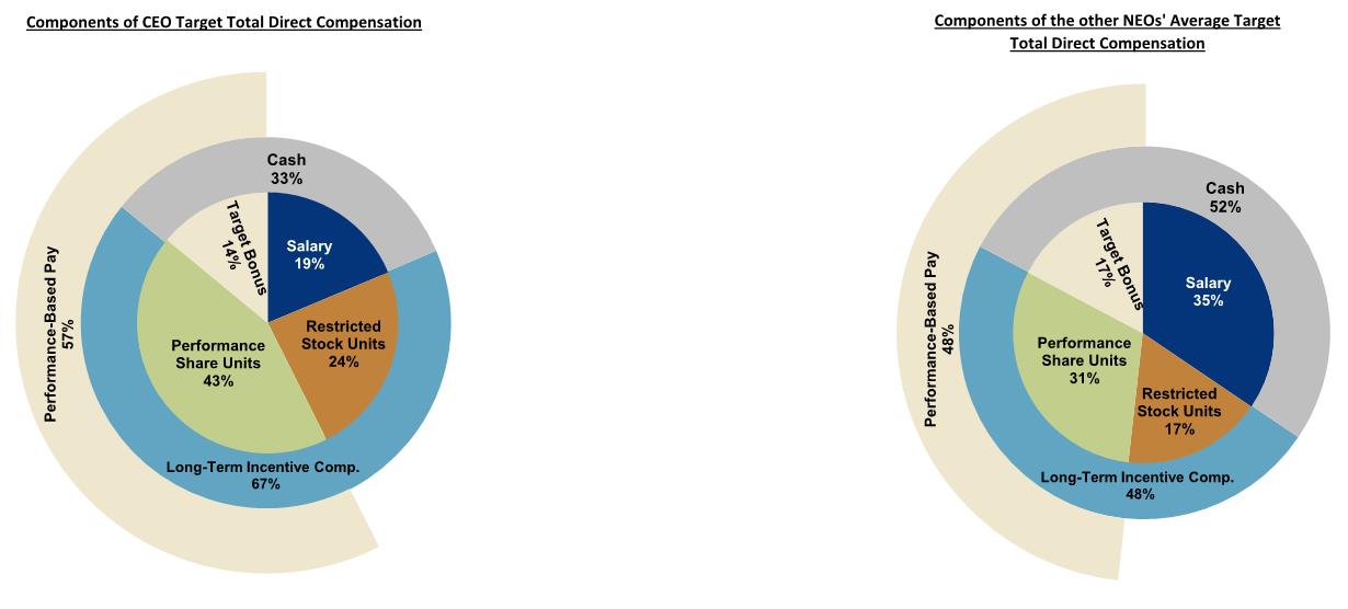 We believe that our compensation programs are strongly aligned with the long-term interests of our stockholders. We believe that equity awards align the interests of our executives with those of our stockholders by encouraging achievement of long-term performance goals. Equity awards are a key component of our executive compensation program. In 2014, equity awards, in the form of PSUs and RSUs, represented between 46% and 67% of our named executive officers’ compensation opportunity.