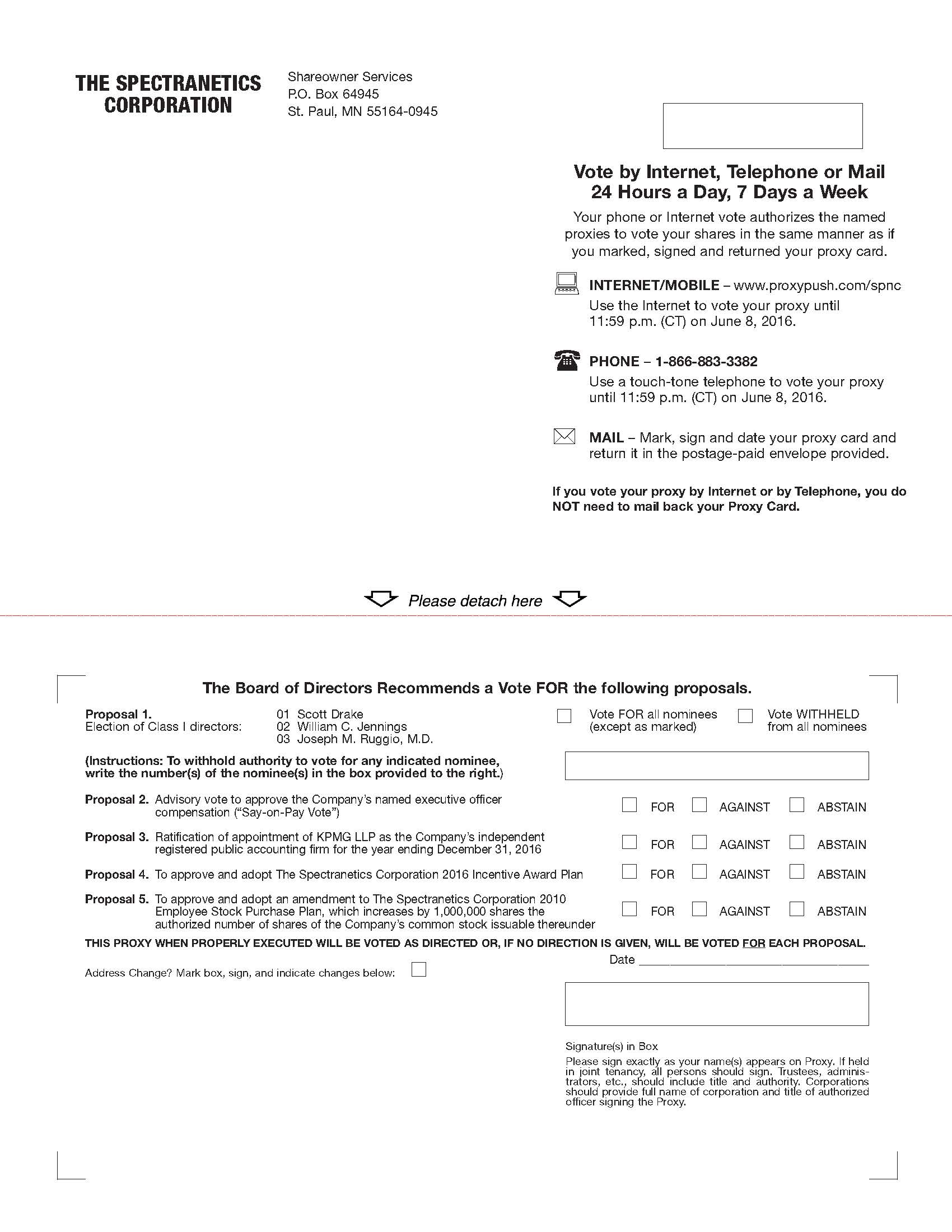 Voting By Proxy Card. Each stockholder may vote by proxy by using the enclosed proxy card. When you return a proxy card properly signed and completed, the shares of common stock represented by your proxy will be voted as you specify on the proxy card. If no specification is made in a properly executed proxy received by us, then the proxy will be voted (i) FOR the election of the three Class I director nominees to the Board in this Proxy Statement, (ii) FOR the approval, on an advisory basis, of the compensation of our named executive officers, (iii) FOR the ratification of the appointment of KPMG LLP as our independent registered public accounting firm, (iv) FOR the approval and adoption of The Spectranetics Corporation 2016 Incentive Award Plan, and (v) FOR the approval and adoption of the amendment to The Spectranetics Corporation 2010 Employee Stock Purchase Plan. If any other matters are brought before the Meeting, the proxy holders will vote as recommended by the Board. If no recommendation is given, the proxy holders will vote in their discretion. If you own common stock through a broker, bank or other nominee that holds common stock for your account in a “street name” capacity, follow the instructions provided by your nominee regarding how to instruct your nominee to vote your shares.