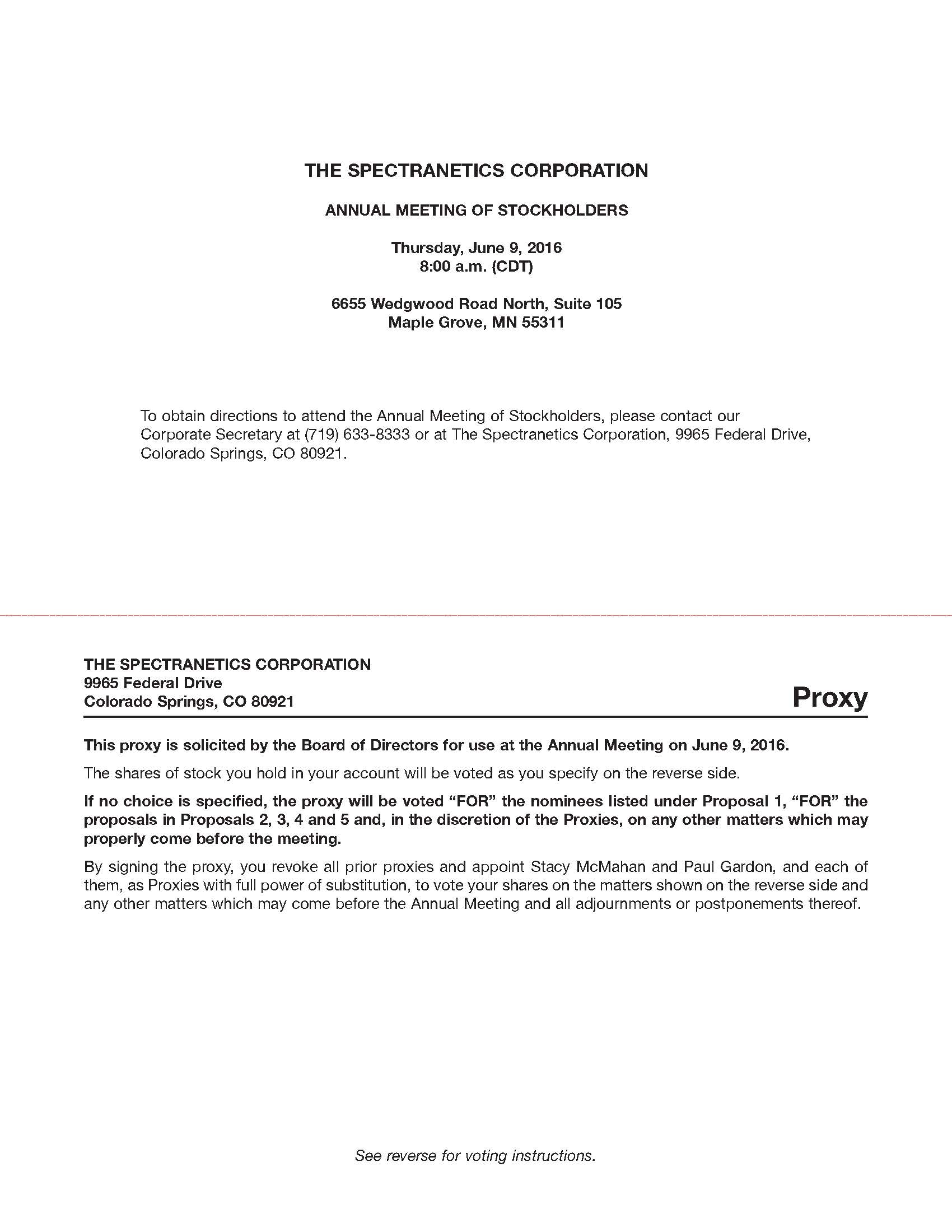 This Proxy Statement is furnished to stockholders of THE SPECTRANETICS CORPORATION (“us,” “we,” “Spectranetics” or the “Company”) to solicit proxies by the Board of Directors (the “Board”) for use at our Annual Meeting of Stockholders (the “Meeting”) to be held at 6655 Wedgwood Road North, Suite 105, Maple Grove, Minnesota 55311 on June 9, 2016, at 8:00 a.m. (CDT). We expect that this Proxy Statement and proxy will be first mailed to stockholders on or about May 4, 2016.