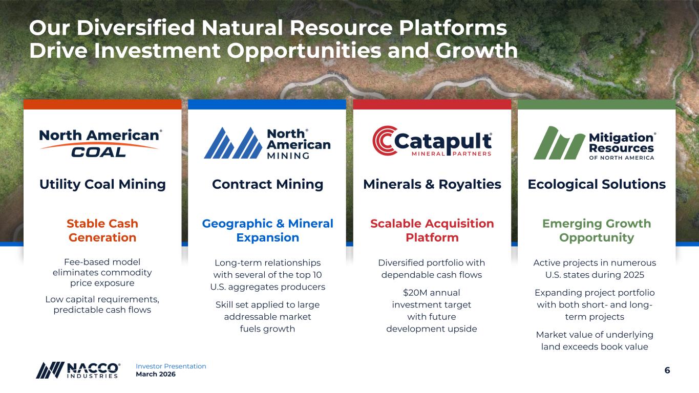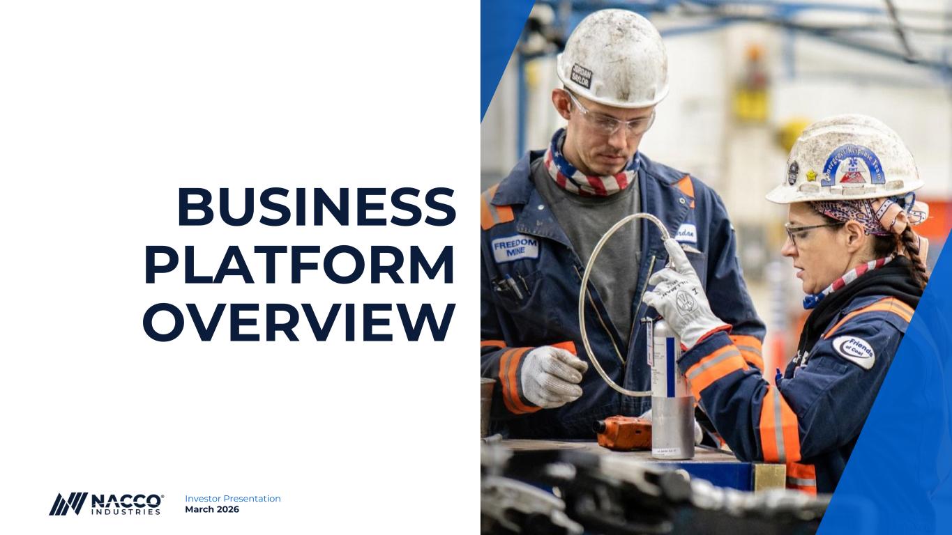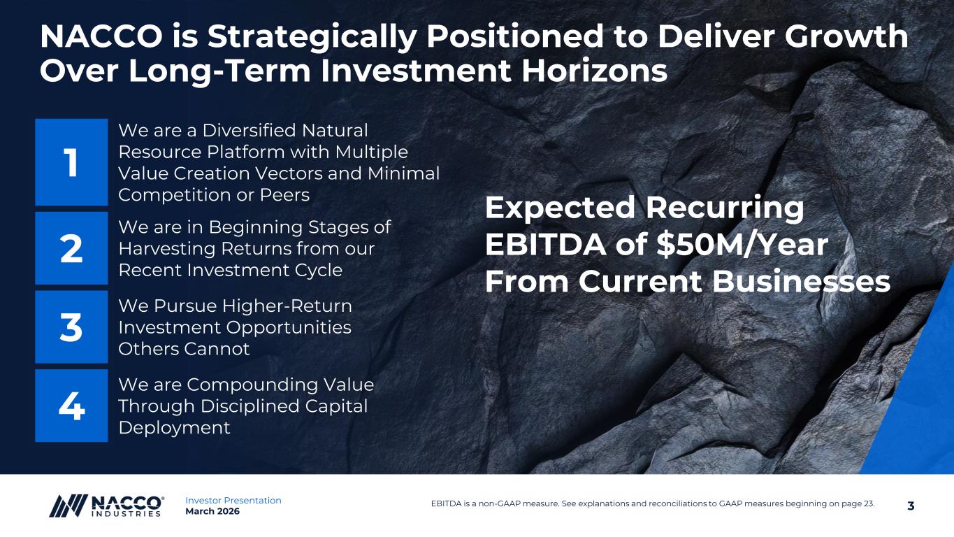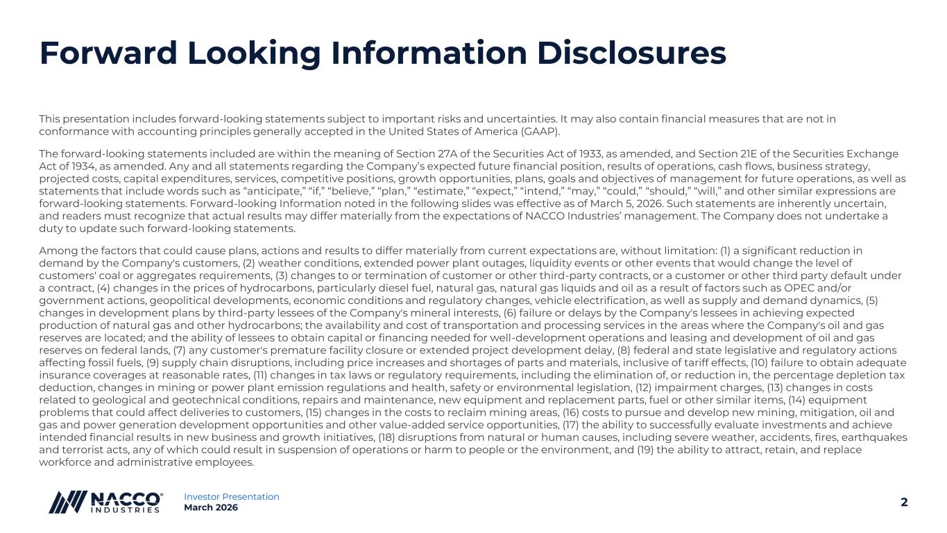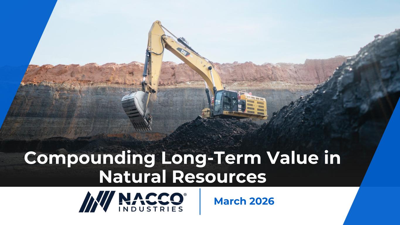 2Investor Presentation March 2026 Forward Looking Information Disclosures This presentation includes forward-looking statements subject to important risks and uncertainties. It may also contain financial measures that are not in conformance with accounting principles generally accepted in the United States of America (GAAP). The forward-looking statements included are within the meaning of Section 27A of the Securities Act of 1933, as amended, and Section 21E of the Securities Exchange Act of 1934, as amended. Any and all statements regarding the Company’s expected future financial position, results of operations, cash flows, business strategy, projected costs, capital expenditures, services, competitive positions, growth opportunities, plans, goals and objectives of management for future operations, as well as statements that include words such as “anticipate,” “if,” “believe,” “plan,” “estimate,” “expect,” “intend,” “may,” “could,” “should,” “will,” and other similar expressions are forward-looking statements. Forward-looking Information noted in the following slides was effective as of March 5, 2026. Such statements are inherently uncertain, and readers must recognize that actual results may differ materially from the expectations of NACCO Industries’ management. The Company does not undertake a duty to update such forward-looking statements. Among the factors that could cause plans, actions and results to differ materially from current expectations are, without limitation: (1) a significant reduction in demand by the Company's customers, (2) weather conditions, extended power plant outages, liquidity events or other events that would change the level of customers' coal or aggregates requirements, (3) changes to or termination of customer or other third-party contracts, or a customer or other third party default under a contract, (4) changes in the prices of hydrocarbons, particularly diesel fuel, natural gas, natural gas liquids and oil as a result of factors such as OPEC and/or government actions, geopolitical developments, economic conditions and regulatory changes, vehicle electrification, as well as supply and demand dynamics, (5) changes in development plans by third-party lessees of the Company's mineral interests, (6) failure or delays by the Company's lessees in achieving expected production of natural gas and other hydrocarbons; the availability and cost of transportation and processing services in the areas where the Company's oil and gas reserves are located; and the ability of lessees to obtain capital or financing needed for well-development operations and leasing and development of oil and gas reserves on federal lands, (7) any customer's premature facility closure or extended project development delay, (8) federal and state legislative and regulatory actions affecting fossil fuels, (9) supply chain disruptions, including price increases and shortages of parts and materials, inclusive of tariff effects, (10) failure to obtain adequate insurance coverages at reasonable rates, (11) changes in tax laws or regulatory requirements, including the elimination of, or reduction in, the percentage depletion tax deduction, changes in mining or power plant emission regulations and health, safety or environmental legislation, (12) impairment charges, (13) changes in costs related to geological and geotechnical conditions, repairs and maintenance, new equipment and replacement parts, fuel or other similar items, (14) equipment problems that could affect deliveries to customers, (15) changes in the costs to reclaim mining areas, (16) costs to pursue and develop new mining, mitigation, oil and gas and power generation development opportunities and other value-added service opportunities, (17) the ability to successfully evaluate investments and achieve intended financial results in new business and growth initiatives, (18) disruptions from natural or human causes, including severe weather, accidents, fires, earthquakes and terrorist acts, any of which could result in suspension of operations or harm to people or the environment, and (19) the ability to attract, retain, and replace workforce and administrative employees.