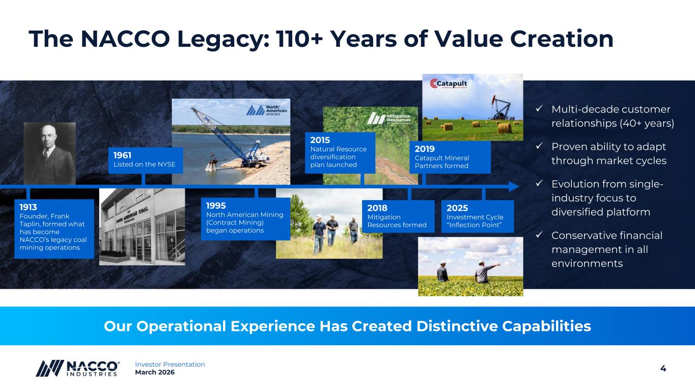 3Investor Presentation March 2026 NACCO is Strategically Positioned to Deliver Growth Over Long-Term Investment Horizons Expected Recurring EBITDA of $50M/Year From Current Businesses 1 We are a Diversified Natural Resource Platform with Multiple Value Creation Vectors and Minimal Competition or Peers 2 We are in Beginning Stages of Harvesting Returns from our Recent Investment Cycle 3 We Pursue Higher-Return Investment Opportunities Others Cannot 4 We are Compounding Value Through Disciplined Capital Deployment EBITDA is a non-GAAP measure. See explanations and reconciliations to GAAP measures beginning on page 23.