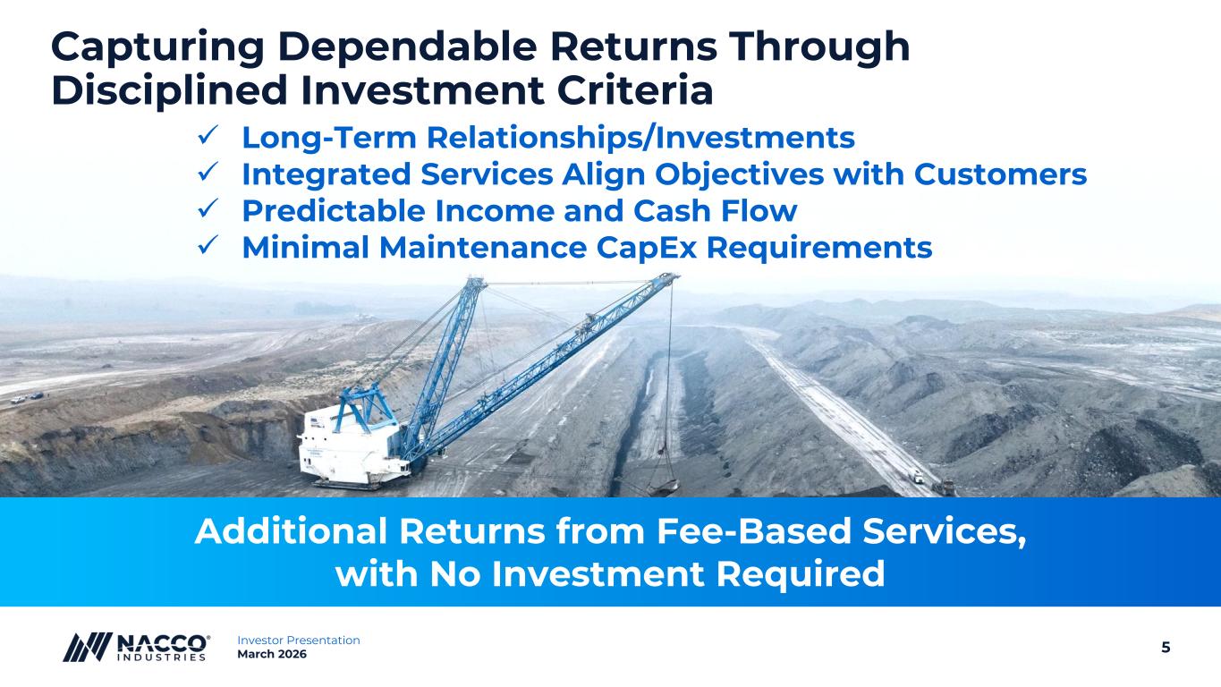 4Investor Presentation March 2026 Our Operational Experience Has Created Distinctive Capabilities The NACCO Legacy: 110+ Years of Value Creation 1961 Listed on the NYSE 1995 North American Mining (Contract Mining) began operations ✓ Multi-decade customer relationships (40+ years) ✓ Proven ability to adapt through market cycles ✓ Evolution from single- industry focus to diversified platform ✓ Conservative financial management in all environments 1913 Founder, Frank Taplin, formed what has become NACCO’s legacy coal mining operations 2015 Natural Resource diversification plan launched 2019 Catapult Mineral Partners formed 2018 Mitigation Resources formed 2025 Investment Cycle “Inflection Point”