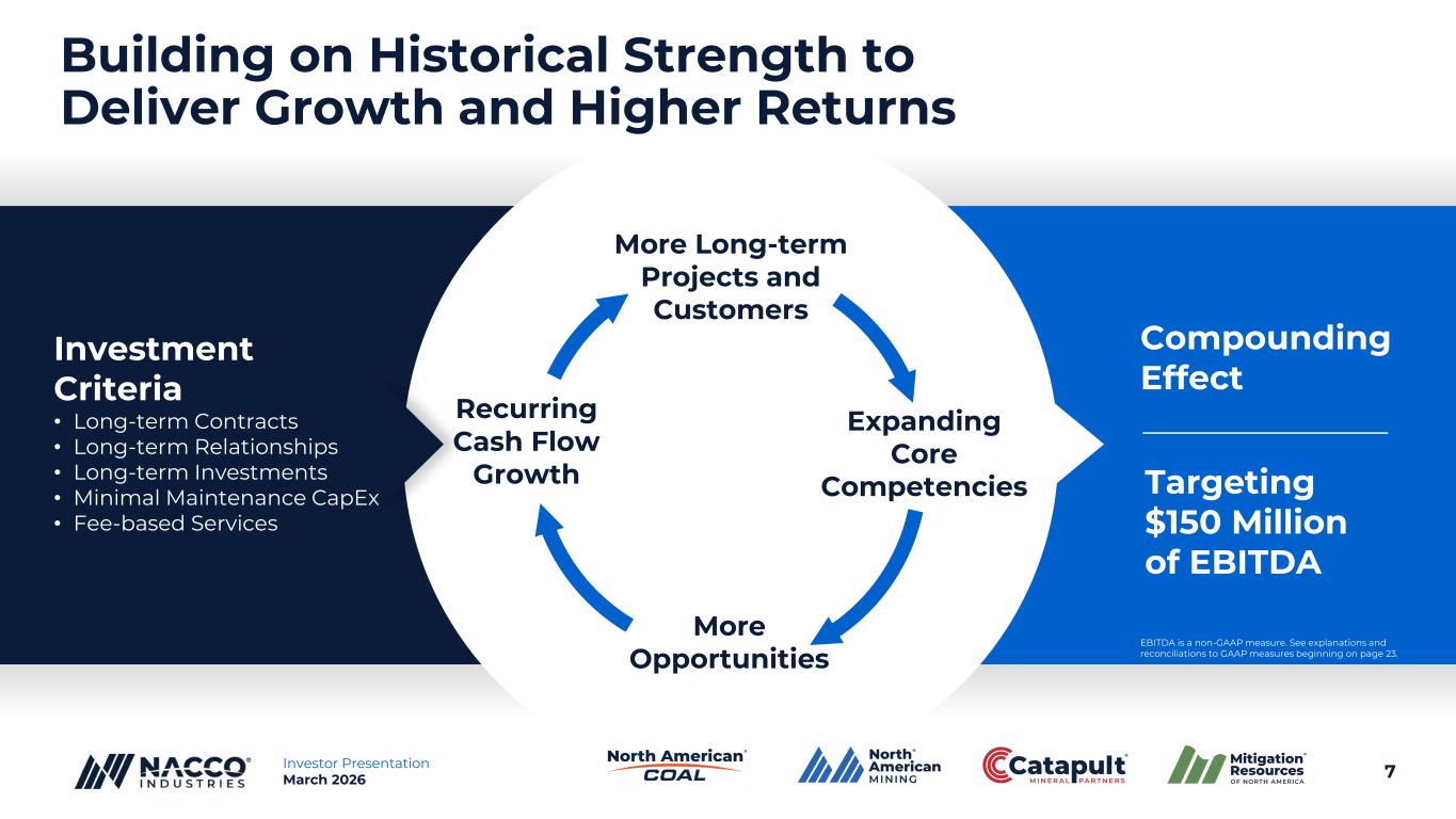 6Investor Presentation March 2026 Our Diversified Natural Resource Platforms Drive Investment Opportunities and Growth (R)Utility Coal Mining Stable Cash Generation Contract Mining Geographic & Mineral Expansion Minerals & Royalties Scalable Acquisition Platform Ecological Solutions Emerging Growth Opportunity Fee-based model eliminates commodity price exposure Low capital requirements, predictable cash flows Diversified portfolio with dependable cash flows $20M annual investment target with future development upside Active projects in numerous U.S. states during 2025 Expanding project portfolio with both short- and long- term projects Market value of underlying land exceeds book value Long-term relationships with several of the top 10 U.S. aggregates producers Skill set applied to large addressable market fuels growth ®