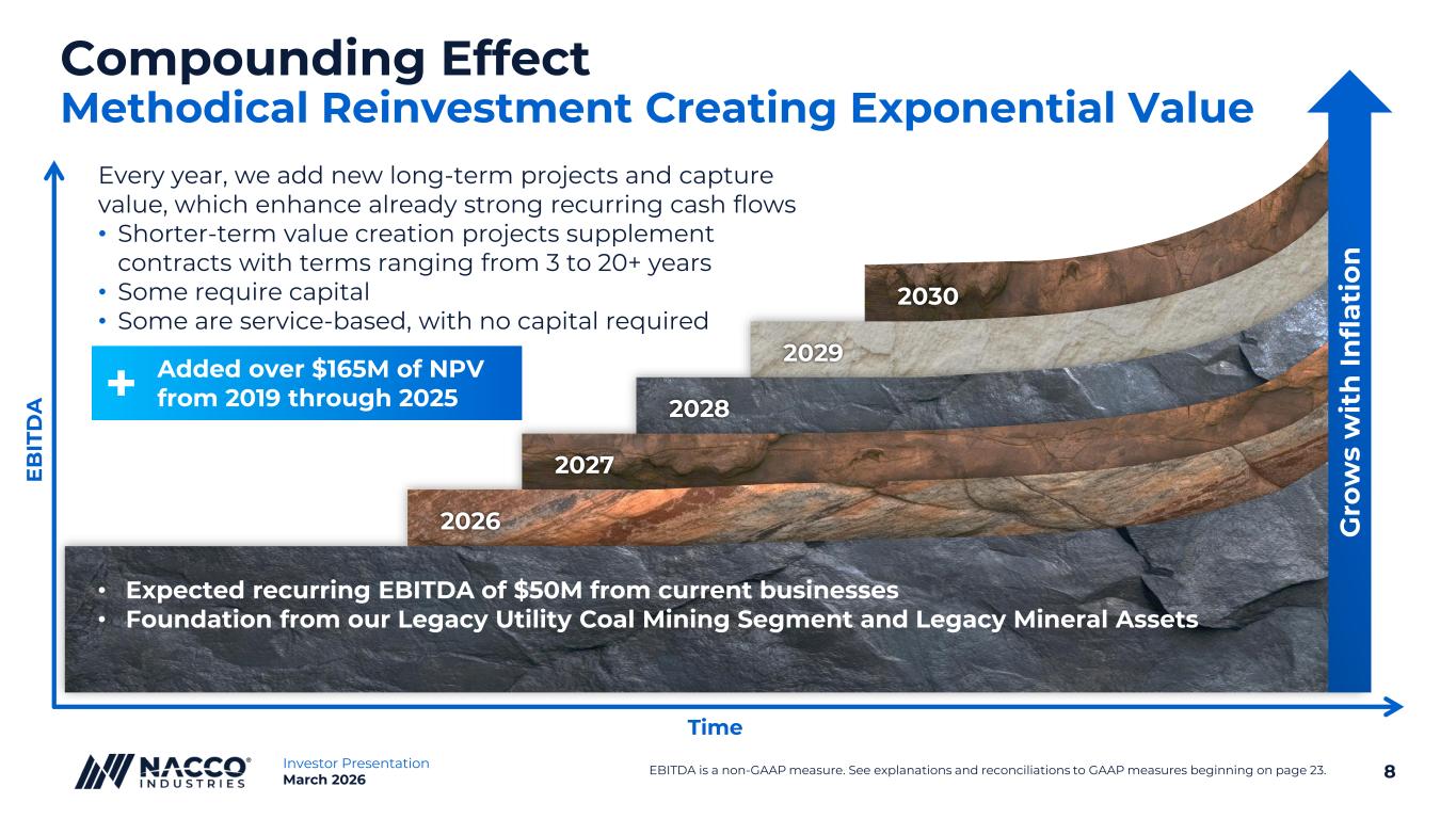 7Investor Presentation March 2026 Building on Historical Strength to Deliver Growth and Higher Returns More Long-term Projects and Customers Expanding Core Competencies Recurring Cash Flow Growth More Opportunities Targeting $150 Million of EBITDA Compounding Effect Investment Criteria • Long-term Contracts • Long-term Relationships • Long-term Investments • Minimal Maintenance CapEx • Fee-based Services EBITDA is a non-GAAP measure. See explanations and reconciliations to GAAP measures beginning on page 23. ®