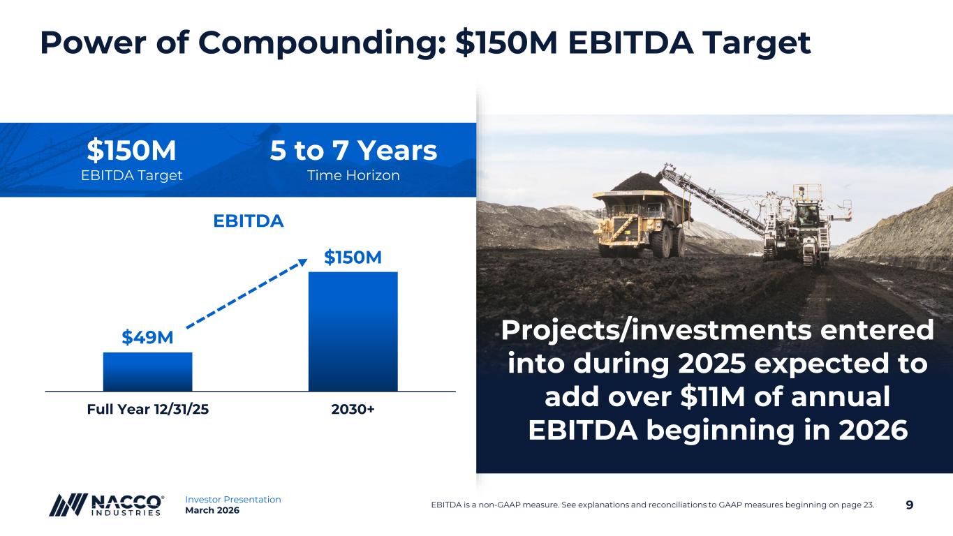 8Investor Presentation March 2026 2030 2029 2028 2027 2026 • Expected recurring EBITDA of $50M from current businesses • Foundation from our Legacy Utility Coal Mining Segment and Legacy Mineral Assets Compounding Effect Methodical Reinvestment Creating Exponential Value Every year, we add new long-term projects and capture value, which enhance already strong recurring cash flows • Shorter-term value creation projects supplement contracts with terms ranging from 3 to 20+ years • Some require capital • Some are service-based, with no capital required Time E B IT D A G ro w s w it h I n fl a ti o n Added over $165M of NPV from 2019 through 2025+ EBITDA is a non-GAAP measure. See explanations and reconciliations to GAAP measures beginning on page 23.
