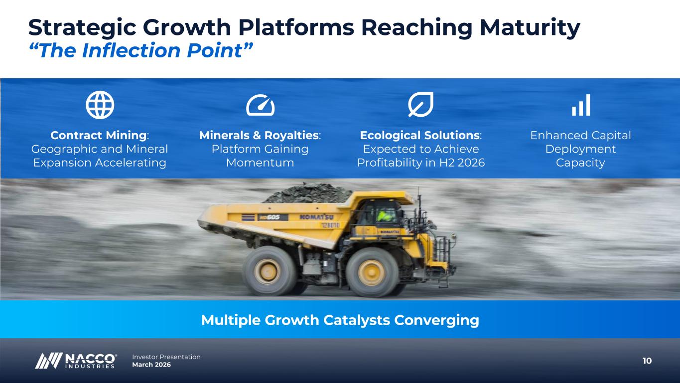 9Investor Presentation March 2026 $49M $150M Full Year 12/31/25 2030+ Power of Compounding: $150M EBITDA Target $150M 5 to 7 Years EBITDA Target Time Horizon Projects/investments entered into during 2025 expected to add over $11M of annual EBITDA beginning in 2026 EBITDA EBITDA is a non-GAAP measure. See explanations and reconciliations to GAAP measures beginning on page 23.