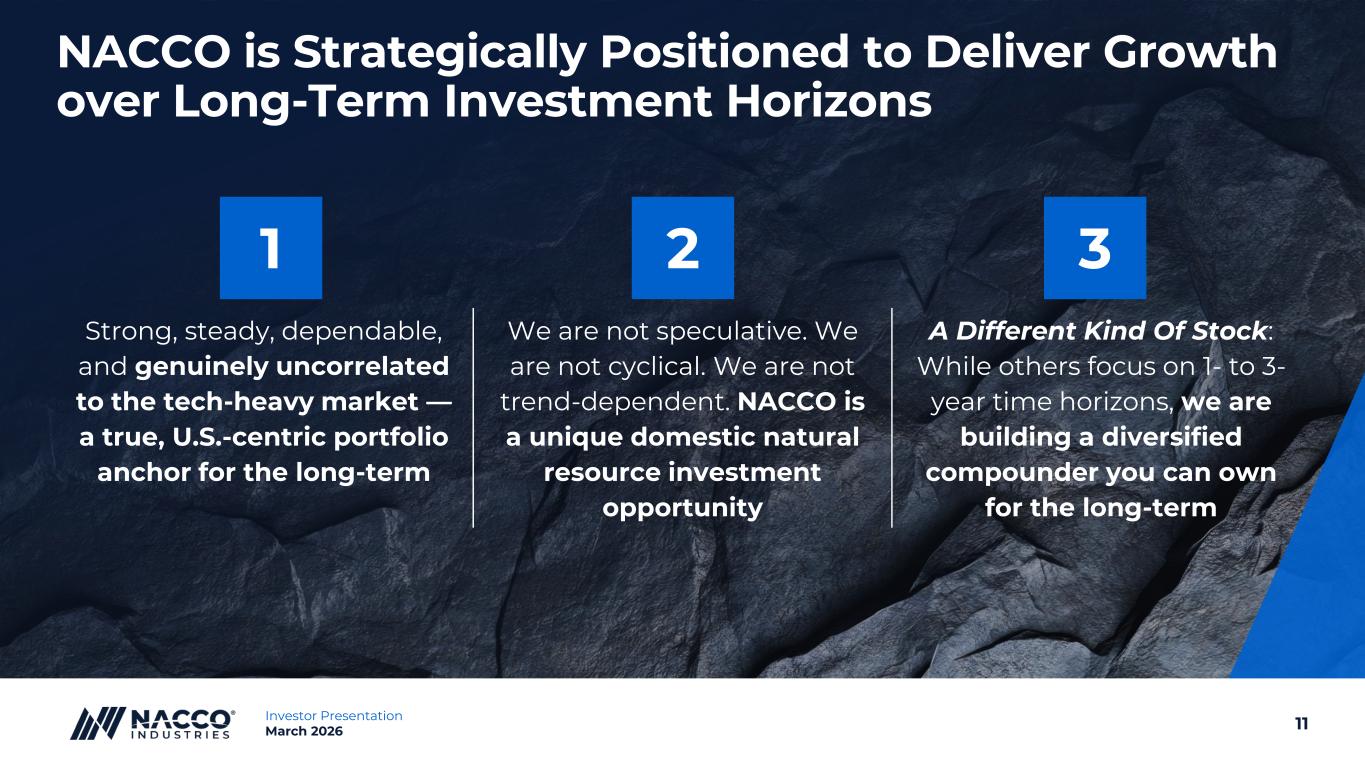 10Investor Presentation March 2026 Strategic Growth Platforms Reaching Maturity “The Inflection Point” Minerals & Royalties: Platform Gaining Momentum Ecological Solutions: Expected to Achieve Profitability in H2 2026 Contract Mining: Geographic and Mineral Expansion Accelerating Enhanced Capital Deployment Capacity Multiple Growth Catalysts Converging