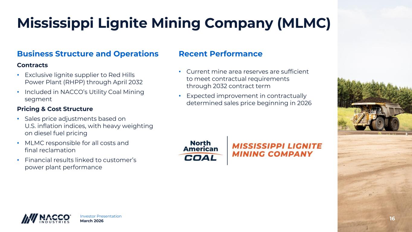 15Investor Presentation March 2026 Coteau* Falkirk Coyote MLMC** Years Active: 1983 - 2037 1978 - Ongoing 2016 - 2040 2002 - 2032 Utility Coal Mining Stable Cash Generation Platform • Long-term customer relationships (40+ years average) • Exclusive mine-mouth supplier to adjacent power plants or synfuels plant • Embedded within customer operations • Fee-based model eliminates commodity price exposure • Predictable cash flows supporting growth in other natural resource platforms • Strategic importance in U.S. baseload power generation in an environment voraciously hungry for power to fuel tech-driven future * Term may be extended for 4 additional successive 5-year periods at the option of Coteau’s customer ** Mississippi Lignite Mining Company