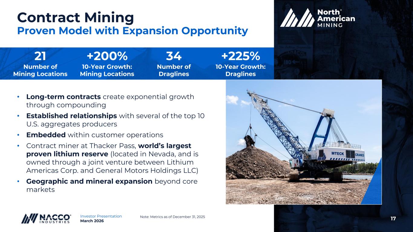 16Investor Presentation March 2026 Mississippi Lignite Mining Company (MLMC) Business Structure and Operations Contracts • Exclusive lignite supplier to Red Hills Power Plant (RHPP) through April 2032 • Included in NACCO’s Utility Coal Mining segment Pricing & Cost Structure • Sales price adjustments based on U.S. inflation indices, with heavy weighting on diesel fuel pricing • MLMC responsible for all costs and final reclamation • Financial results linked to customer’s power plant performance Recent Performance • Current mine area reserves are sufficient to meet contractual requirements through 2032 contract term • Expected improvement in contractually determined sales price beginning in 2026